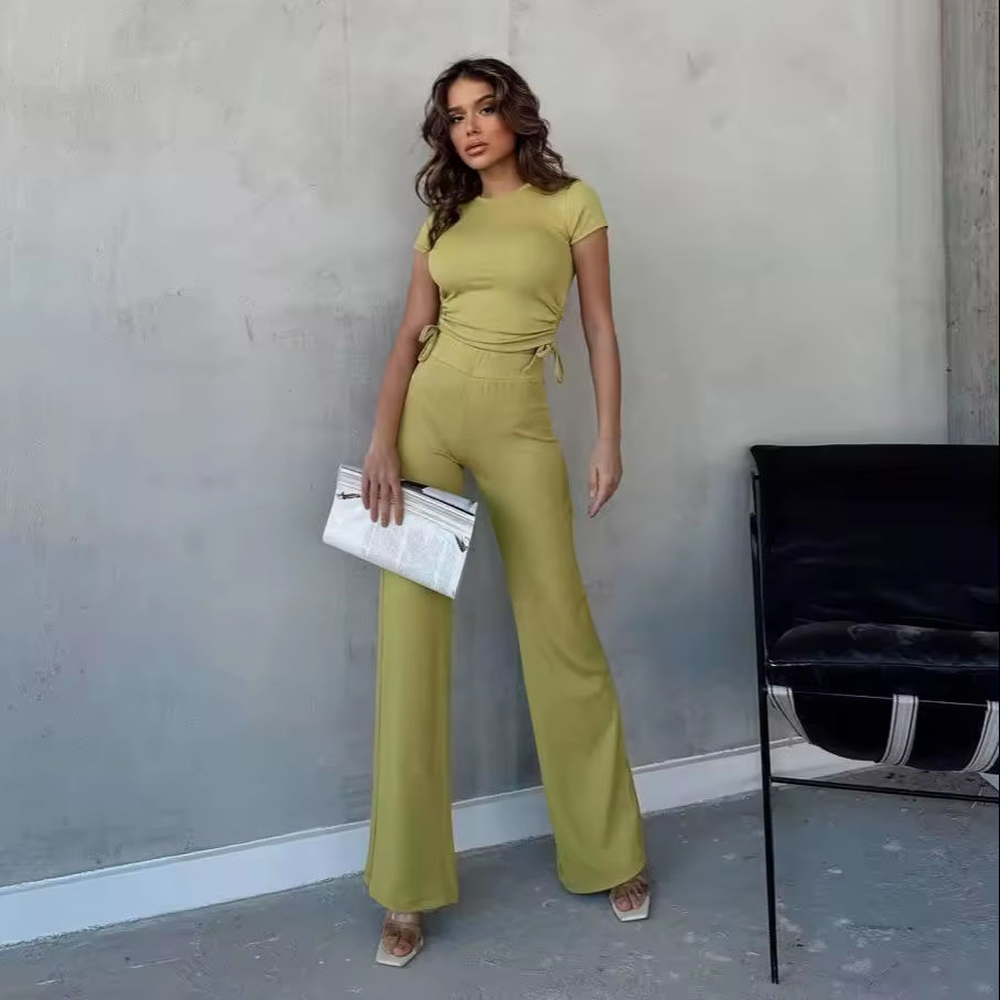 ชุดเสื้อครอปแขนสั้นเอวสูงและกางเกงขากว้างสำหรับผู้หญิงเสื้อเอวลอยสีพื้น