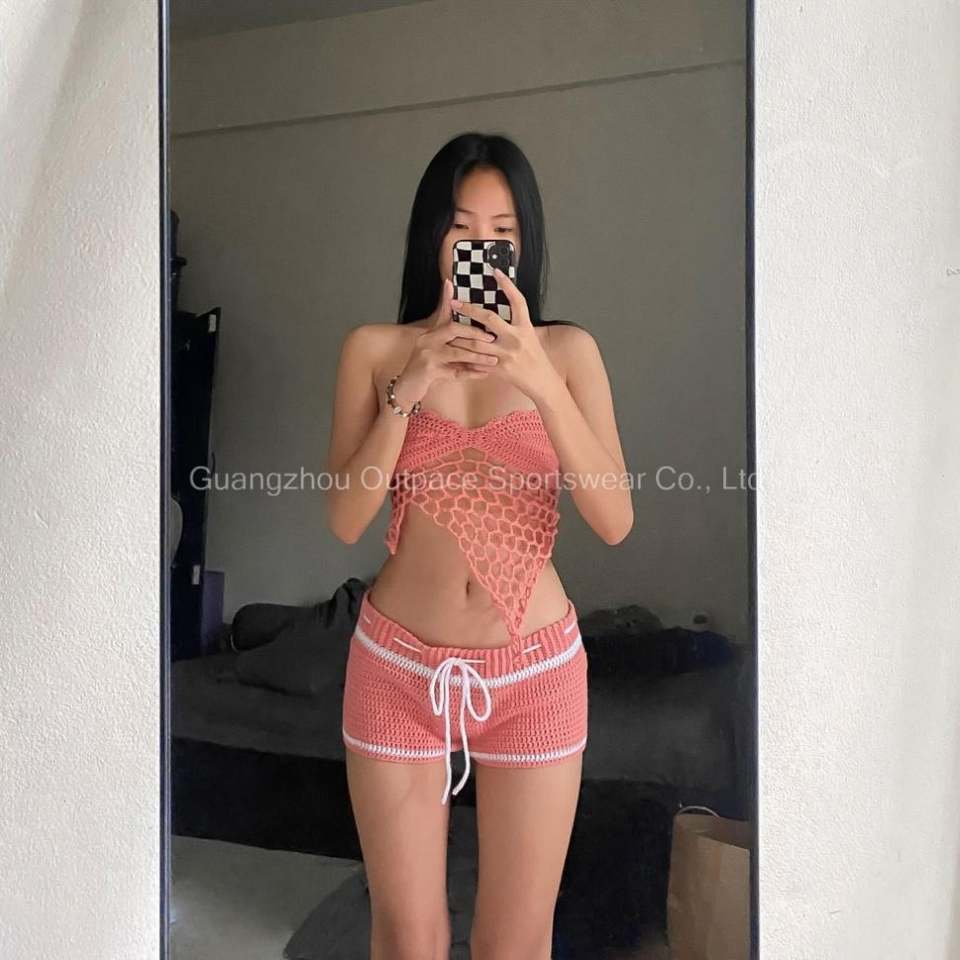 ชุดบิกินี่โครเชต์ 2 ชิ้นสำหรับผู้หญิง โพลีเอสเตอร์/ไนลอน บราเล็ตต์ไร้ตะเข็บแบบดันทรง คอเสื้อเปิดหลัง แต่งระบาย ตกแต่งเอว