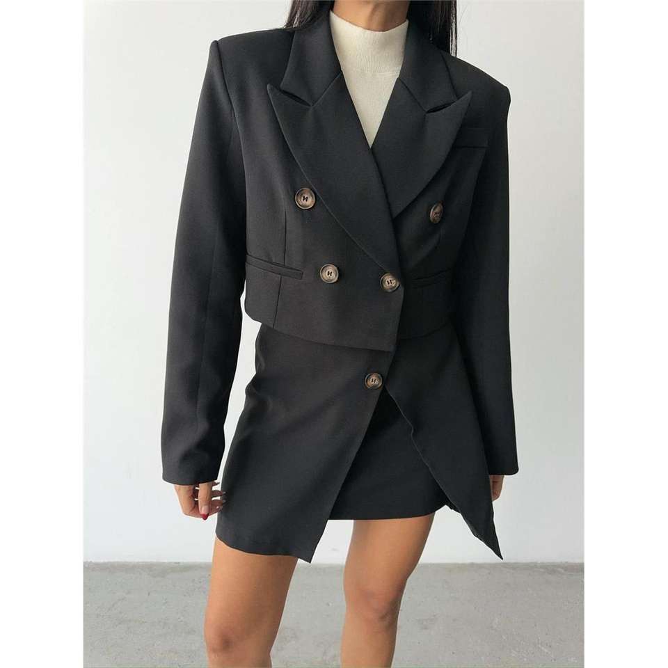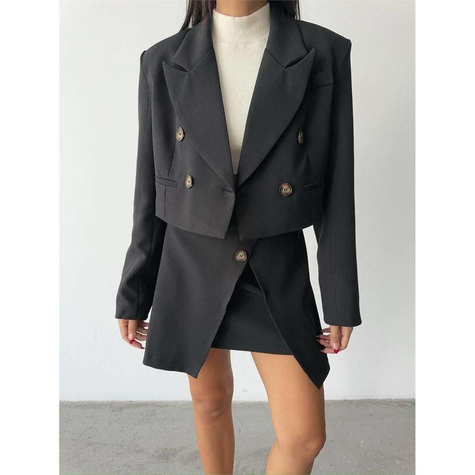 ชุดเสื้อครอปและกระโปรงติดกระดุมสำหรับผู้หญิง สีดำ