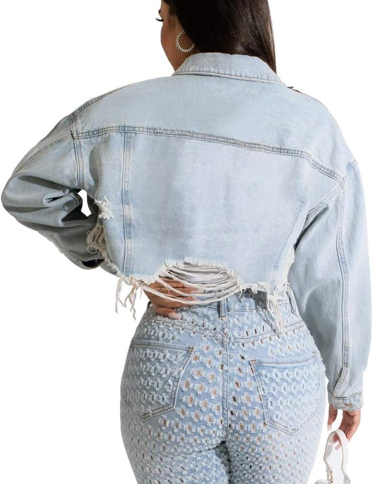 แจ็กเก็ตยีนส์ครอปของผู้หญิงพร้อมกระดุมแขนยาวแบบขาดๆออกแบบมาเป็นฝอยสำหรับฤดูใบไม้ร่วง/ฤดูหนาว