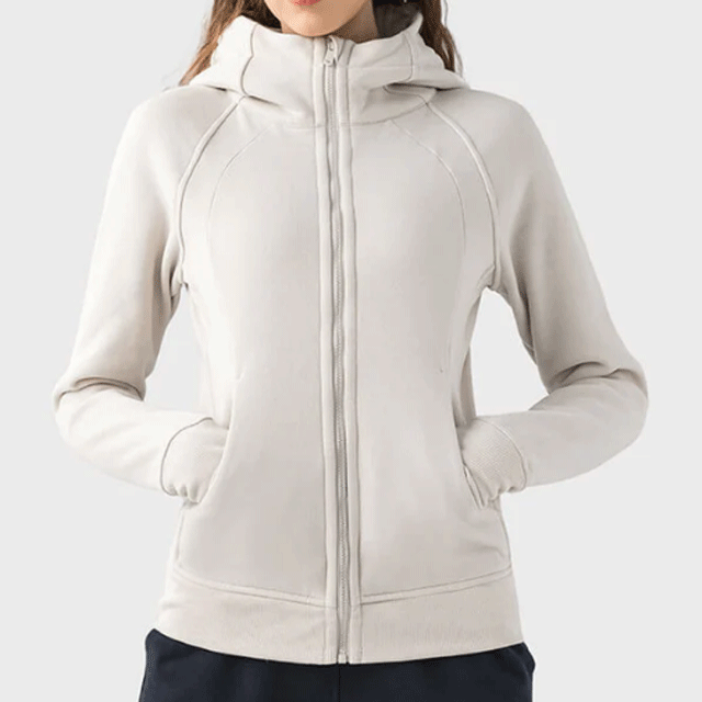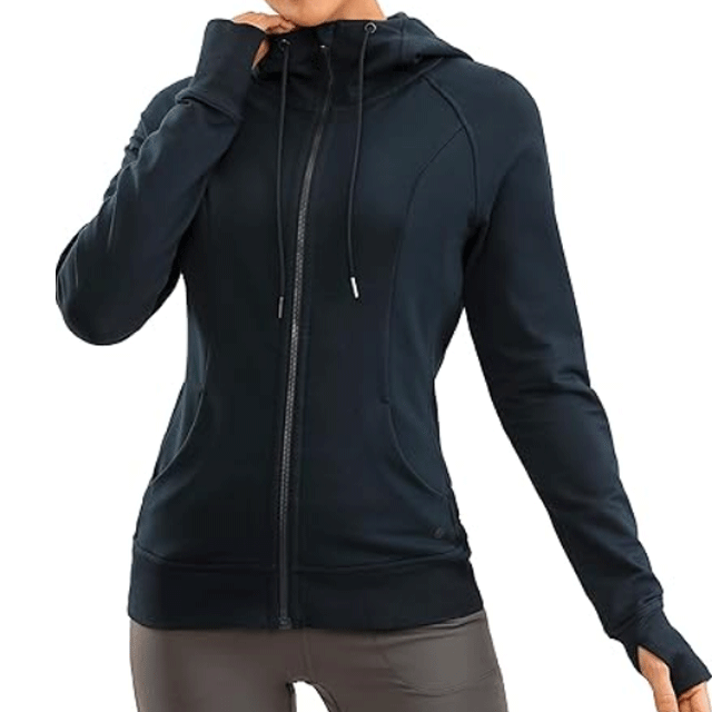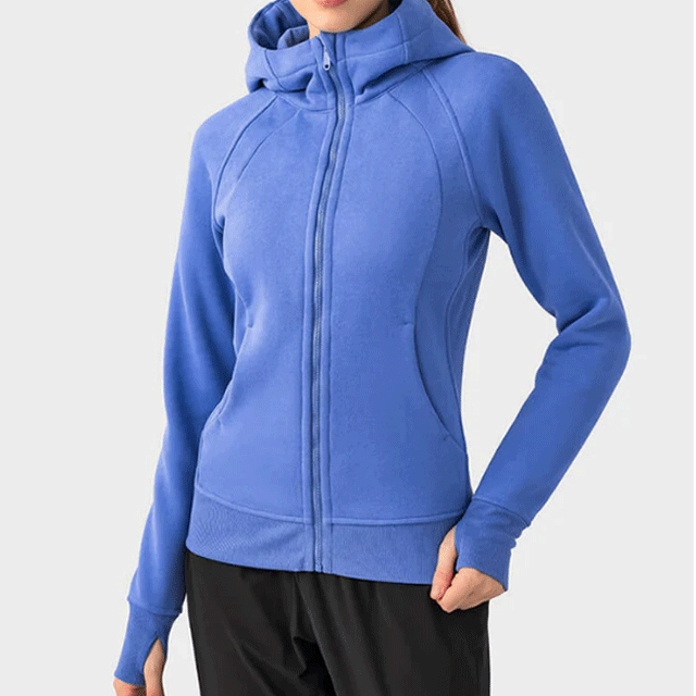 เสื้อแจ็คเก็ตมีฮู้ดผ้าฝ้ายฟลีซสีน้ำเงินพิมพ์ลายด้านหน้าสำหรับผู้หญิง สวมใส่ได้ทั้งในร่มและกลางแจ้ง เหมาะสำหรับออกกำลังกาย ไม่หดตัว เป็นมิตรกับสิ่งแวดล้อม ระบายอากาศได้ดี