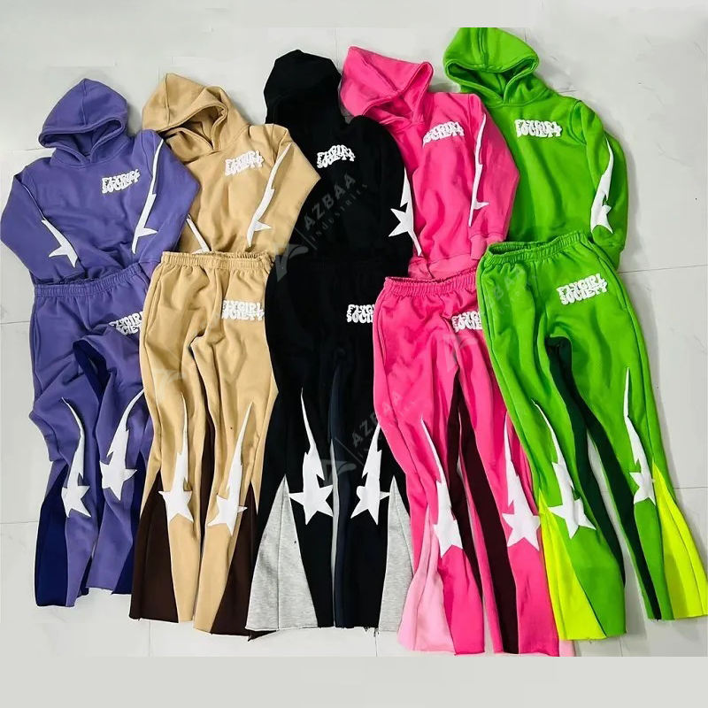 คีย์เวิร์ด:ชุดเสื้อกางเกงวอร์มมีฮู้ดและกางเกงขาบานดีไซน์ใหม่