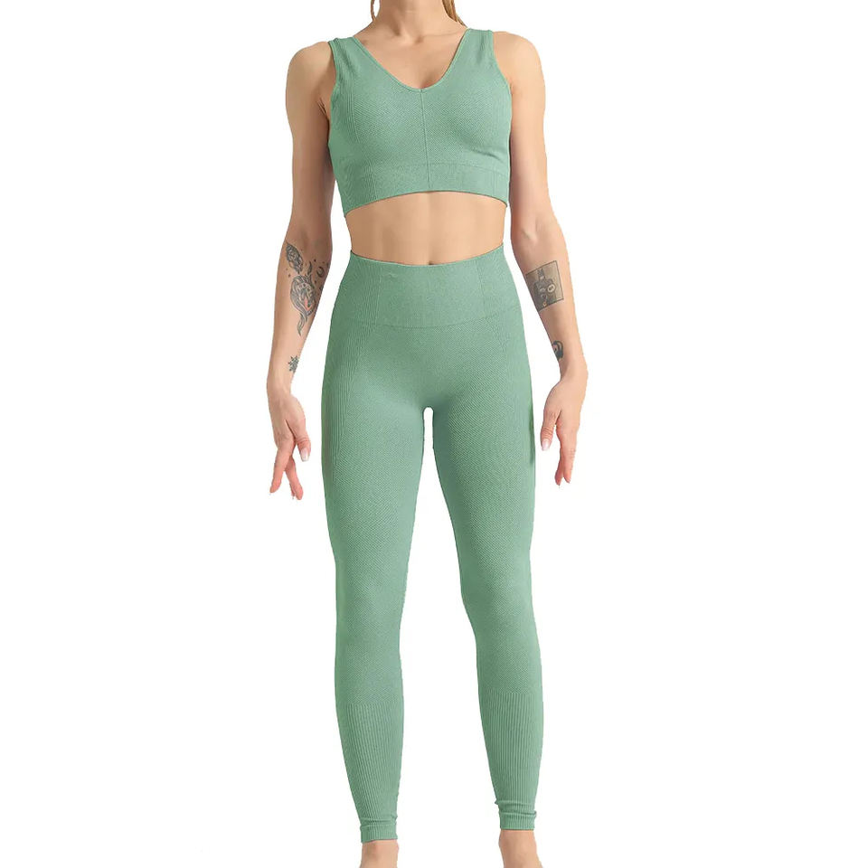 ชุดโยคะ2ชิ้นสำหรับผู้หญิงชุดโยคะสีเขียวผ้ามัดย้อมระบายอากาศได้ดี2025ออกแบบโลโก้ได้ตามต้องการ
