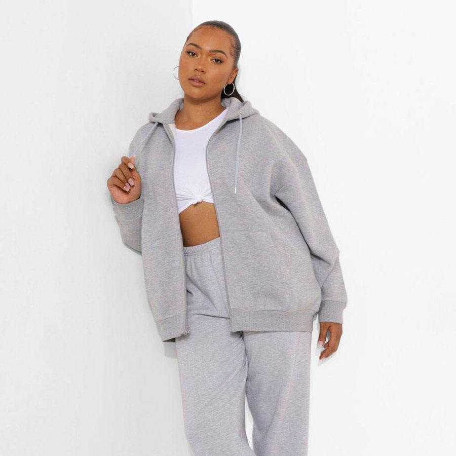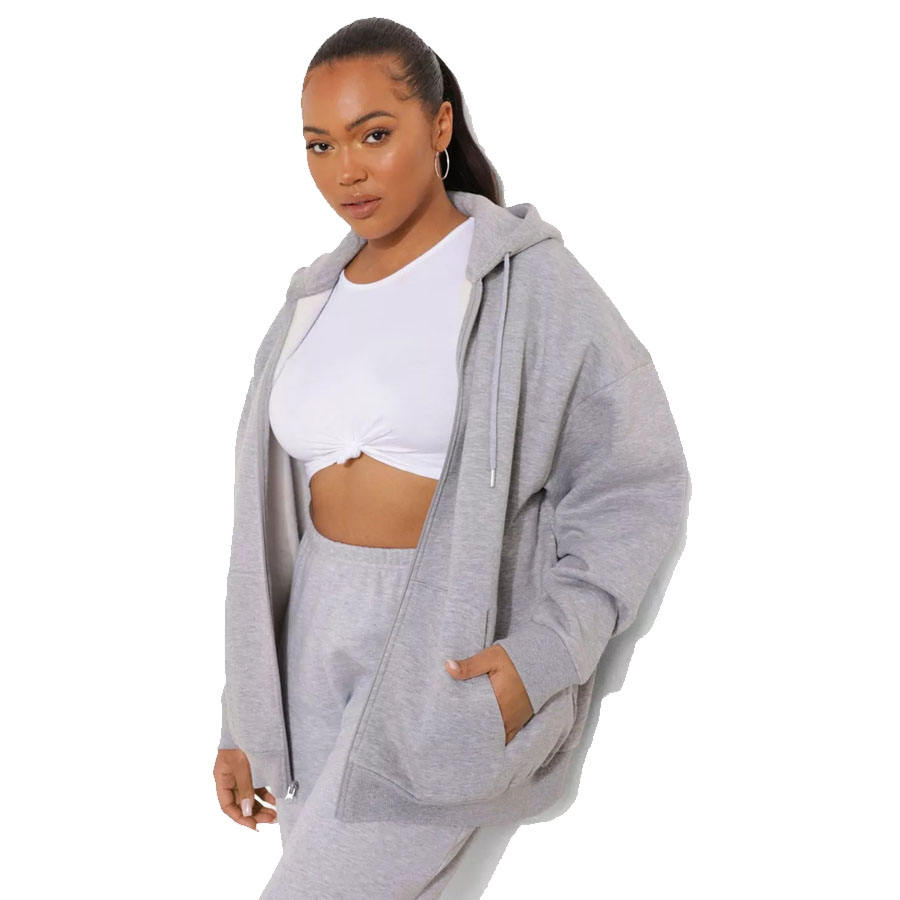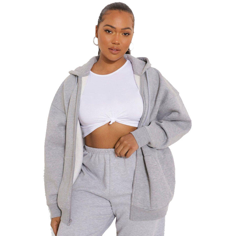 เสื้อฮู้ดซิปผู้หญิง สกรีนโลโก้ตามสั่ง ผ้าหนา สำหรับฤดูหนาว แขนยาว สไตล์ลำลอง ไซส์ใหญ่ สีเทา มีฮู้ด โลโก้ด้านหน้า