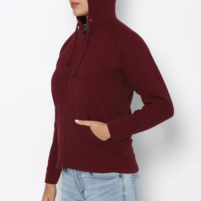 เสื้อฮู้ดซิปผ้าฝ้ายพิมพ์ลายตามสั่งสำหรับผู้หญิง ระบายอากาศได้ดี สวมใส่สบายในฤดูหนาว สีแดงเบอร์กันดี ปรับแต่งสีได้ พร้อมโลโก้ด้านหน้า