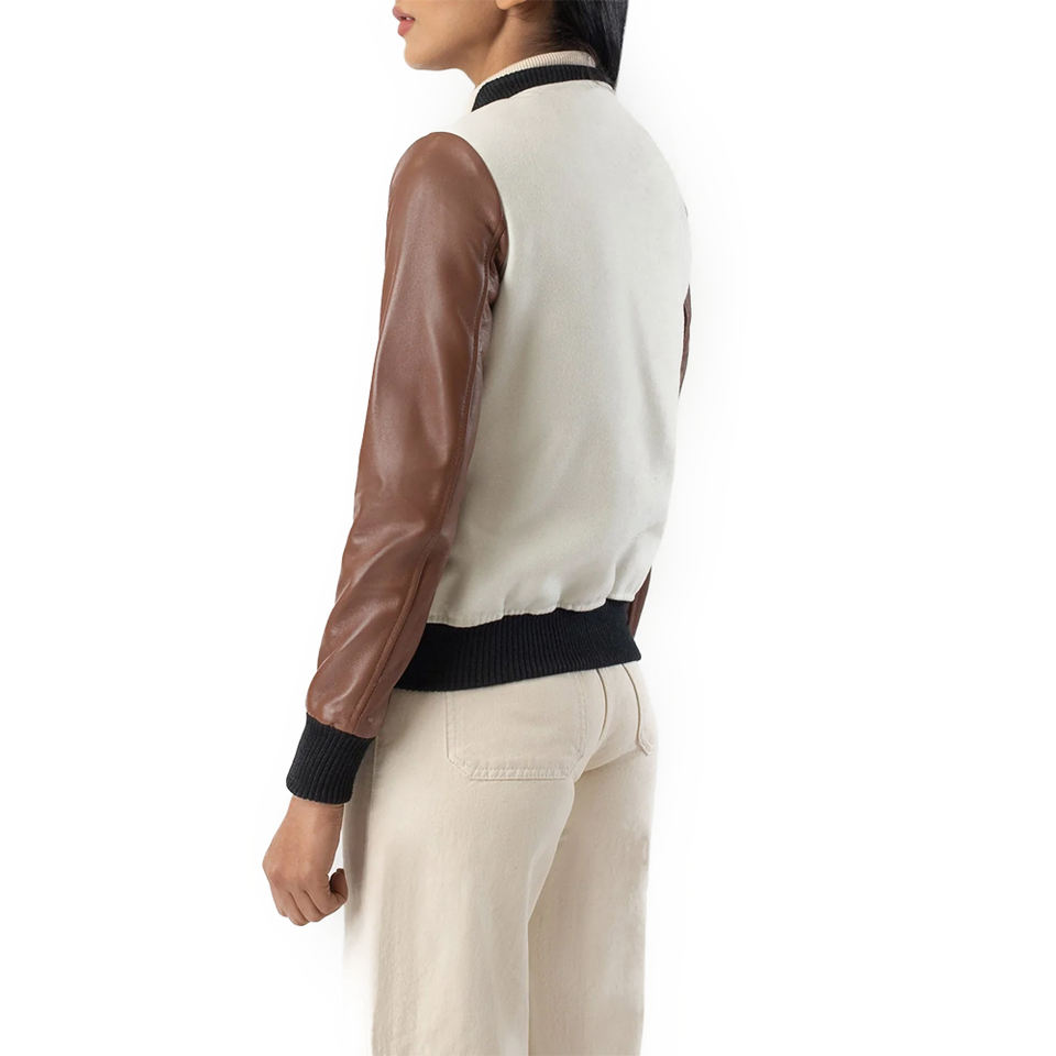 แจ็คเก็ตวาร์ซิตี้ผู้หญิงสั่งทำพิเศษ สีขาว-น้ำตาล ผสมผสาน คุณภาพสูง ตกแต่งอย่างดี แขนหนังแกะ ตัวเสื้อทำจากผ้าขนสัตว์ คอผูกโบว์ สำหรับฤดูใบไม้ร่วง รับผลิตแบบ OEM