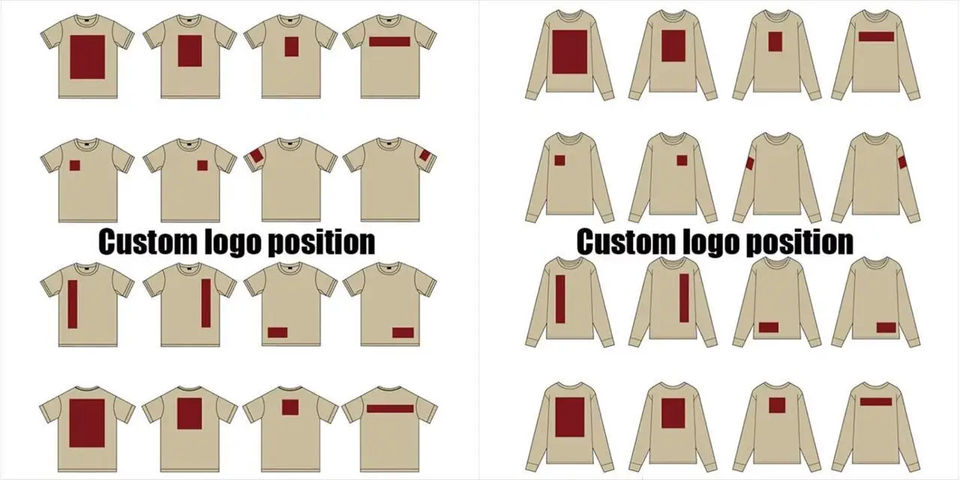 ตำแหน่งโลโก้:ด้านหน้า, ด้านหลัง, ขอบล่าง, หลังคอ, เอว