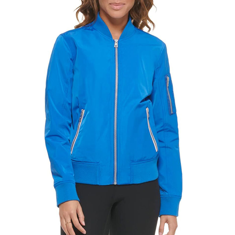เสื้อแจ็คเก็ตบอมเบอร์ผู้หญิงคุณภาพสูงแบบสั่งทำพิเศษ พร้อมซิปด้านหน้า ผ้าซาตินบุใยฝ้าย ผ้าถัก