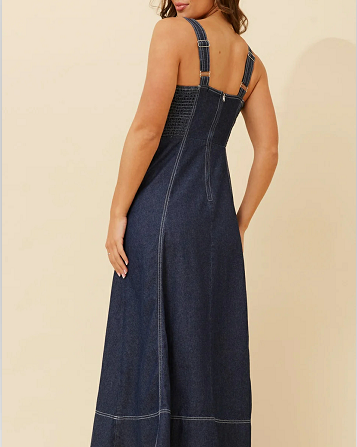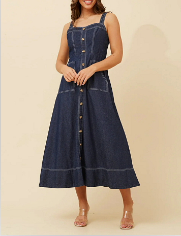 เดรสยีนส์ผู้หญิงทรงคามิมิดิ ติดกระดุมด้านหน้า แต่งตะเข็บตัดกัน พร้อมกระเป๋าใช้งานได้จริง