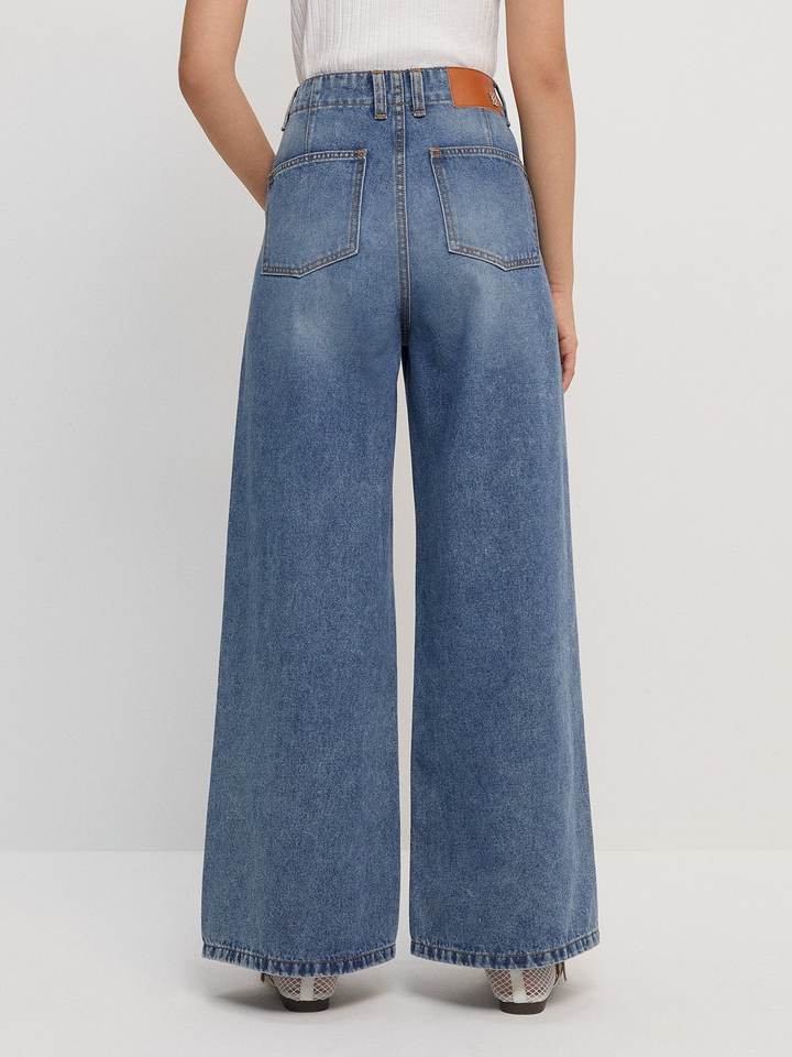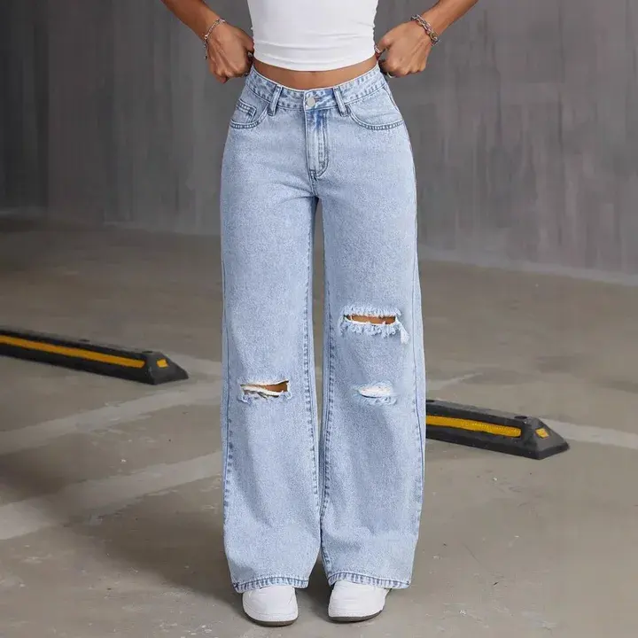 กางเกงยีนส์ทรงหลวมขาบานเอวสูงสำหรับผู้หญิง ผ้าเดนิมสีพื้น ลุคสบายๆ ล้างแบบดิสเทรส เป็นมิตรต่อสิ่งแวดล้อม