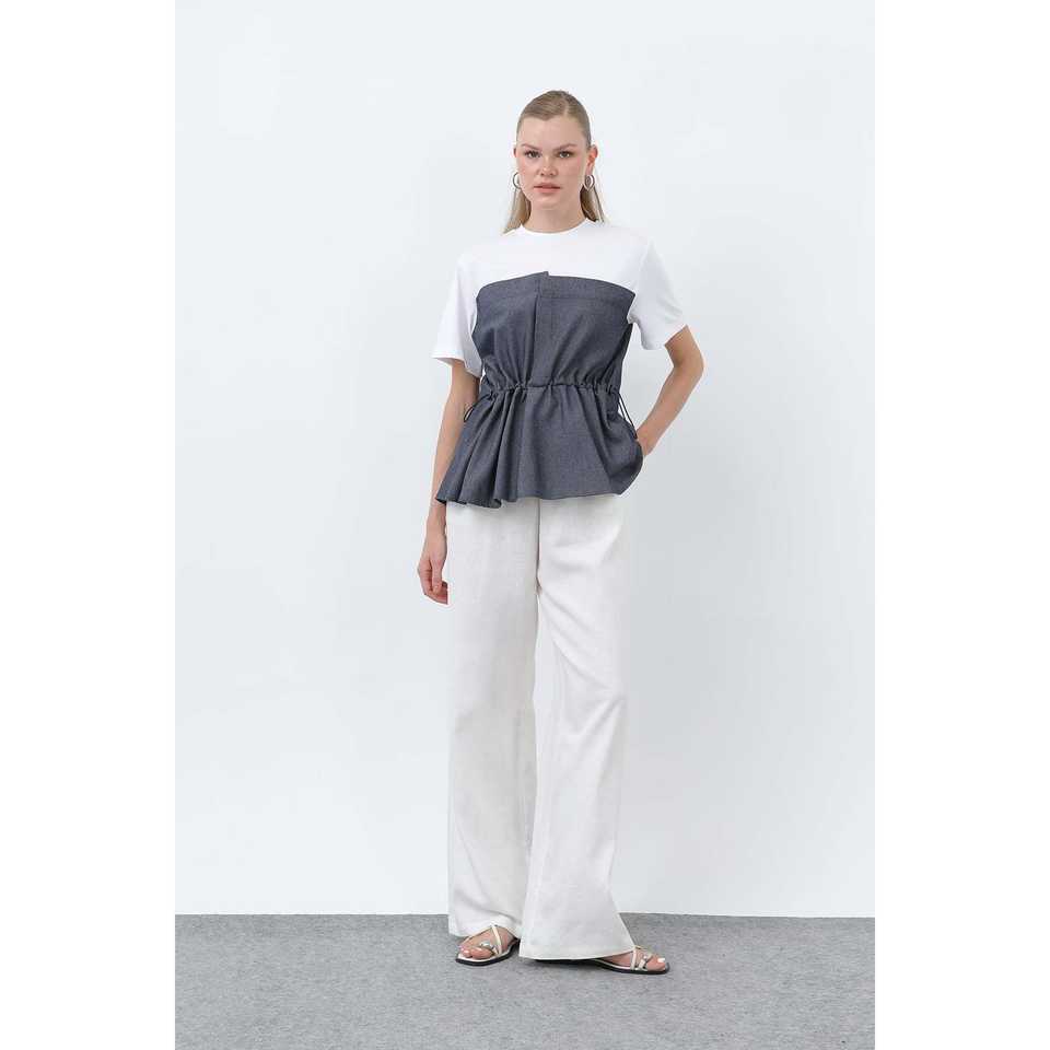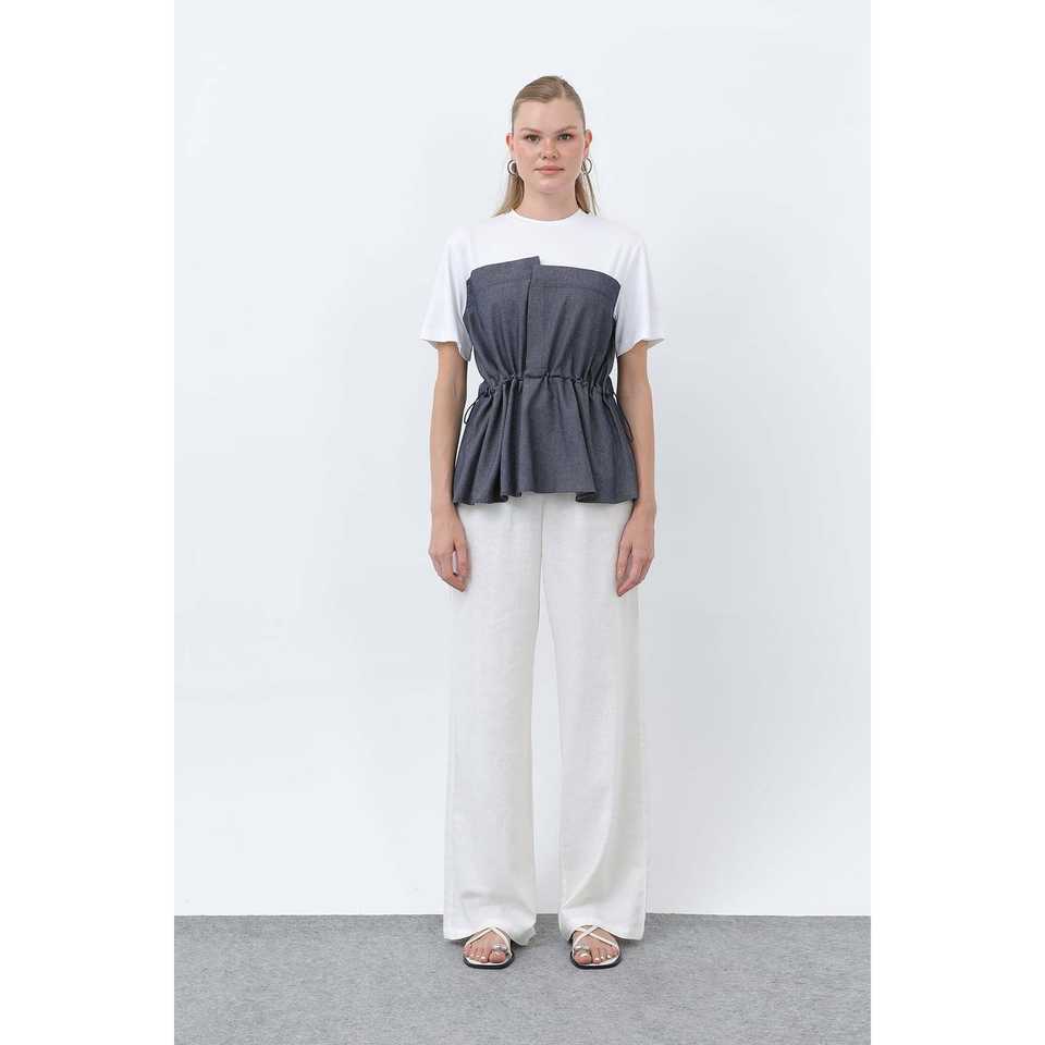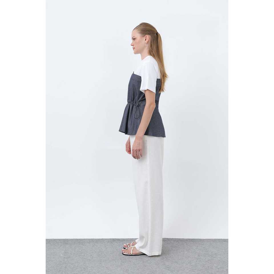 เสื้อเบลาส์ผ้าเดนิมสีตัดกันสำหรับผู้หญิงแขนสั้น 32318BLZ