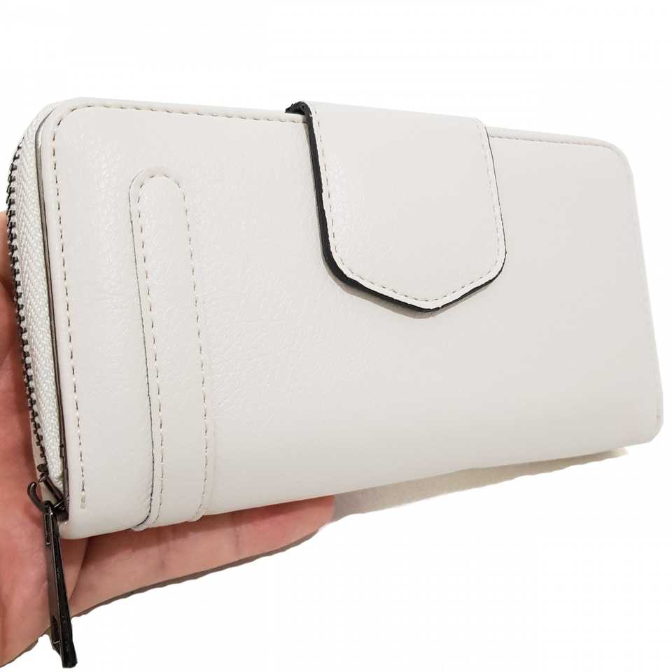 กระเป๋าสตางค์หนังแท้สองช่องสำหรับผู้หญิงหนังเทียมสีครีมมีลายโลโก้แบบพับยาวและสั้นแบบพกพา