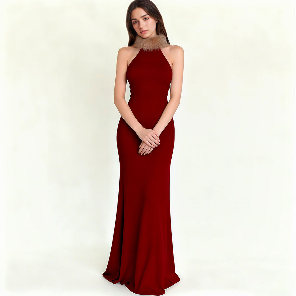 ชุดเดรสยาวทรงบอลกาวน์สำหรับผู้หญิง เอวธรรมชาติ ปี 2025 ฤดูใบไม้ร่วง แขนกุด แต่งขนเทียม เป็นมิตรกับสิ่งแวดล้อม ระบายอากาศได้ดี สง่างาม สไตล์วินเทจ