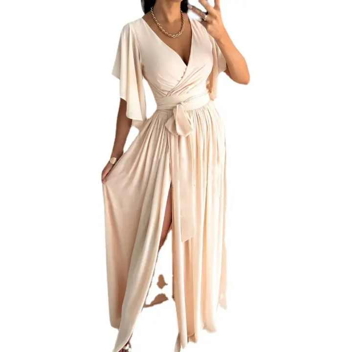 เดรสยาวผู้หญิงแบบสวมใส่สบาย เป็นมิตรกับสิ่งแวดล้อม เหมาะสำหรับฤดูร้อน ดีไซน์คอวีไขว้ สีพื้น เรียบหรู สไตล์ลำลอง ตกแต่งผ้าแบบแพทช์เวิร์ค เหมาะสำหรับฤดูใบไม้ร่วง