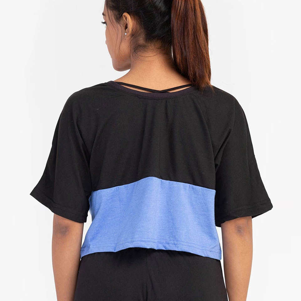 เสื้อยืดแขนสั้นผ้าฝ้ายทรงครอปสีดำน้ำเงินเรียบง่ายสไตล์ลำลองสำหรับผู้หญิงรักษ์โลก