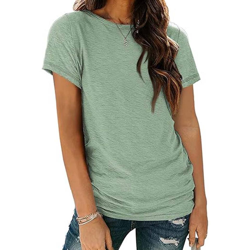 เสื้อยืดคอกลมแขนสั้นแฟชั่นรักษ์โลกสำหรับผู้หญิง เนื้อผ้าถักน้ำหนักเบา สีพื้น ใส่สบายในฤดูร้อน แห้งเร็ว