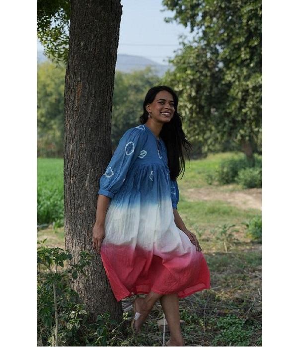 ชุดเดรสแนวโบฮีเมียนแบบปะต่อผ้าเป็นมิตรต่อสิ่งแวดล้อมสำหรับผู้หญิงเครื่องแต่งกายแนวรีสอร์ตลำลองทำจากผ้าฝ้ายสามสีขายส่ง