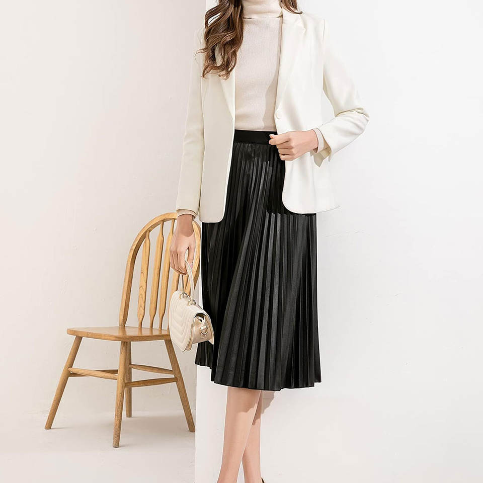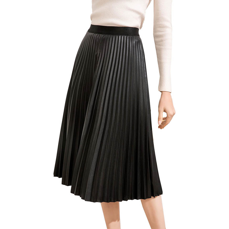 กระโปรงหนังทรงเอเอวสูงยืดหยุ่นสำหรับผู้หญิง ซ่อนซิป จีบระบาย ทรงเอ ความยาวปานกลาง ขายส่ง