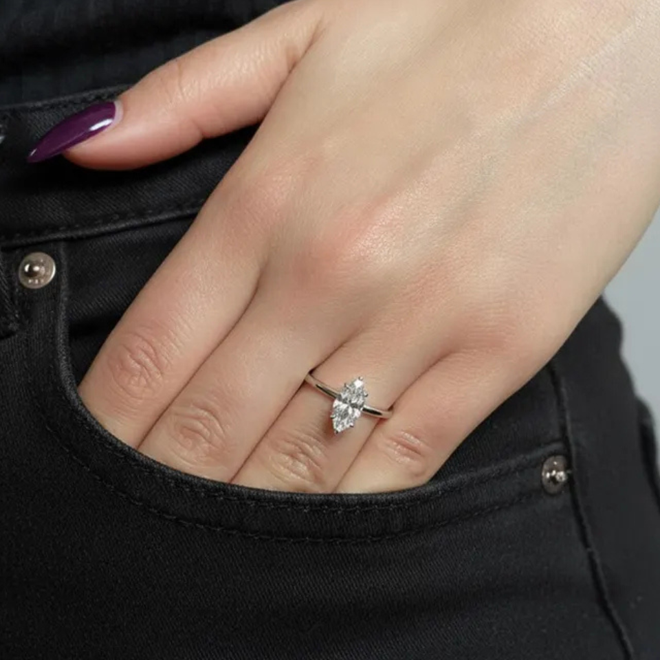 แหวนหมั้นเพชรเม็ดเดี่ยวทรงมาร์คีส์ 2 กะรัต เพชรเลี้ยงในห้องปฏิบัติการ ดีไซน์หกขา ประดับทอง 14K ชุบโรเดียม สำหรับผู้หญิง