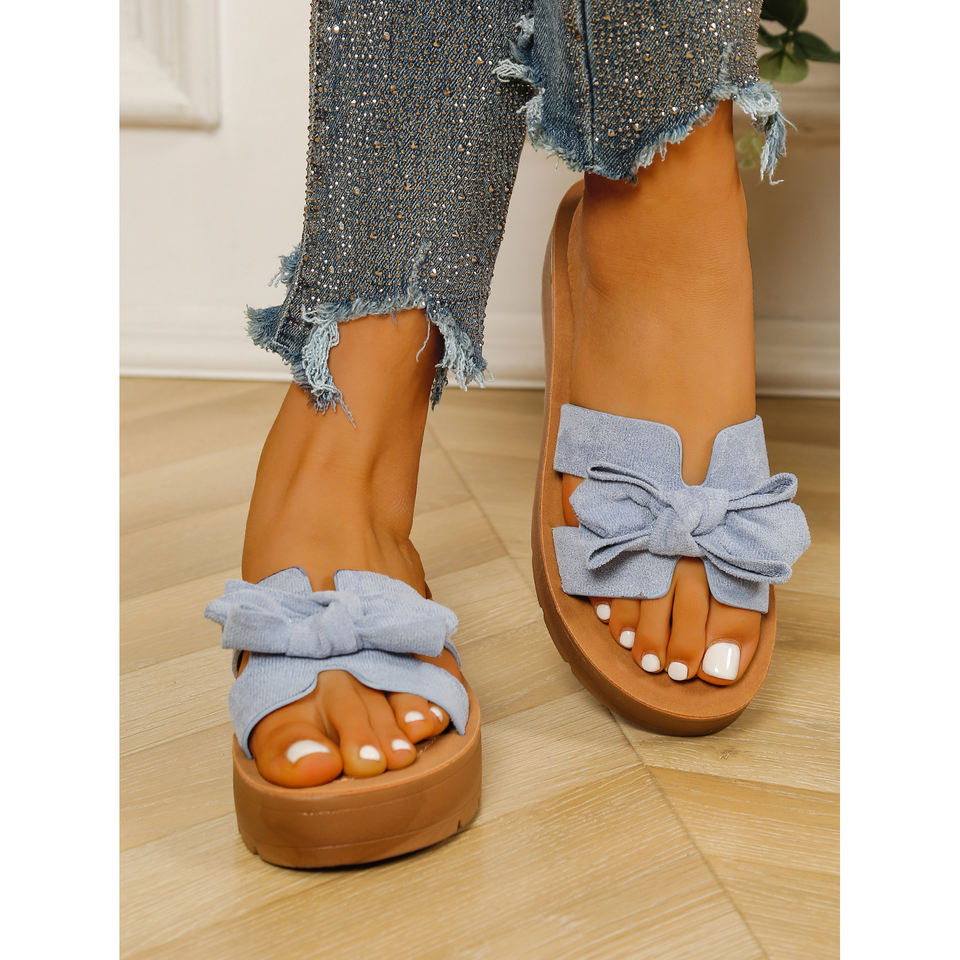 รองเท้าแตะส้นลิ่มสไตล์โบฮีเมียนสำหรับผู้หญิง, รองเท้าส้นลิ่มโบฮีเมียนที่หรูหราพร้อมเชือกปิดพื้นหนาสบายๆมีโบว์สำหรับปาร์ตี้แบบเปิดหลัง