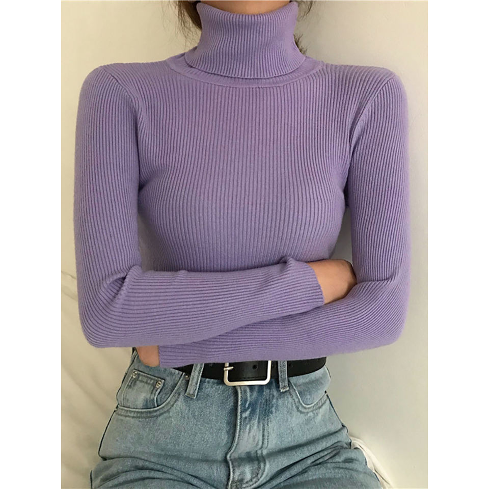 Women's Elegant Chic Vintage Harajuku Jumper Autumn Winter Turtleneck Pullover Purple Slim Elastic Basic Knit Tops One Size Fits