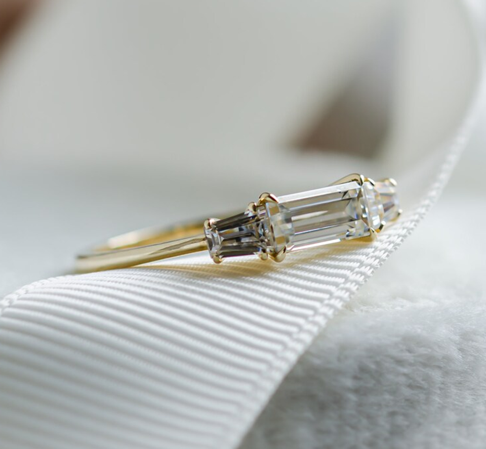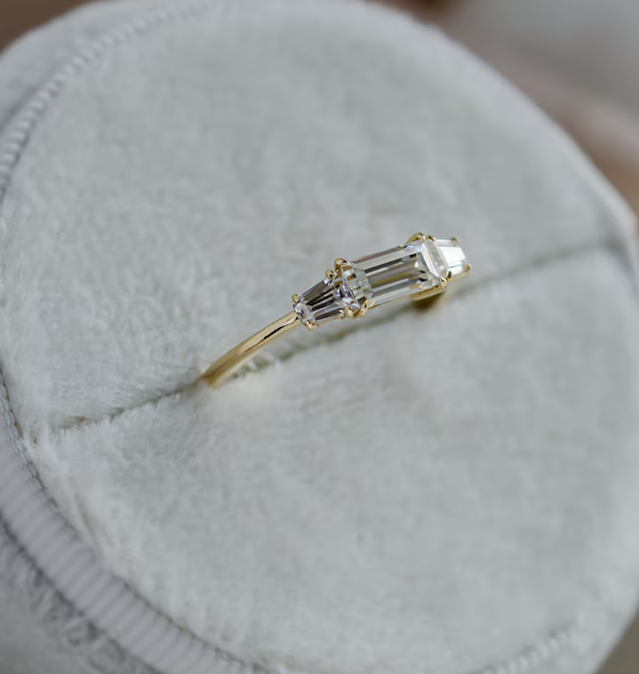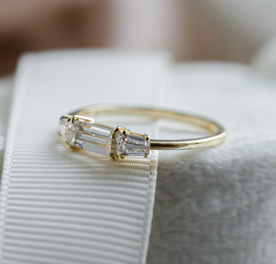 แหวนหมั้นทองคำ14K สไตล์ตะวันออกตะวันตกสุดหรูสำหรับผู้หญิงแหวนหมั้นทำจากหินสามชิ้นแบบบาแกตต์ตัดเพชรที่โรแมนติกสำหรับงานปาร์ตี้งานแต่งงาน