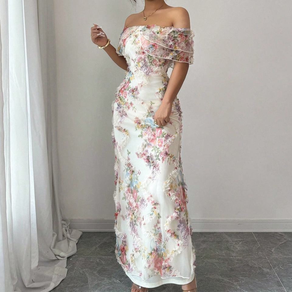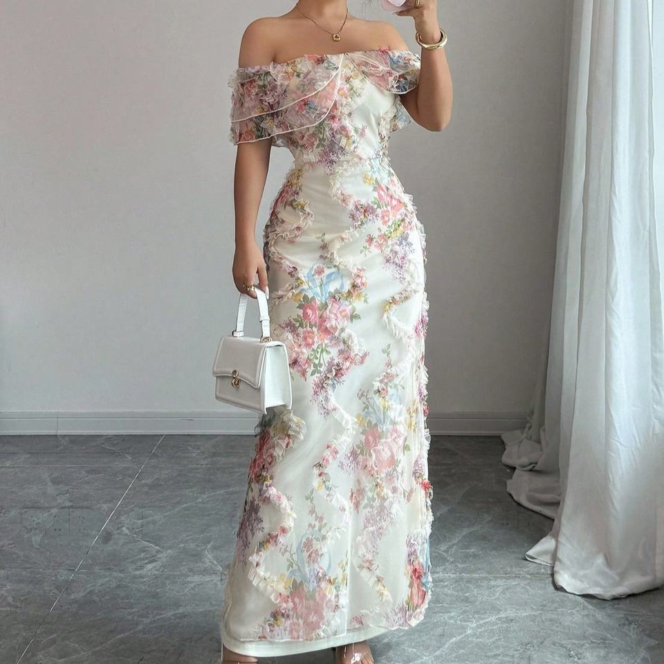 ชุดเดรสยาวพิมพ์ลายดอกไม้สไตล์โรแมนติกหรูหราสำหรับผู้หญิง ตกแต่งระบาย ไหล่เฉียง ผ้าทออย่างดี เป็นมิตรต่อสิ่งแวดล้อม แฟชั่นทันสมัย