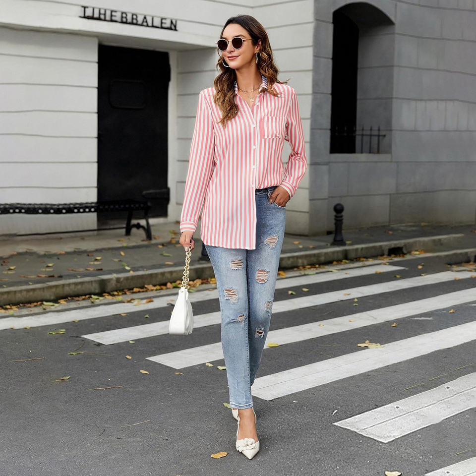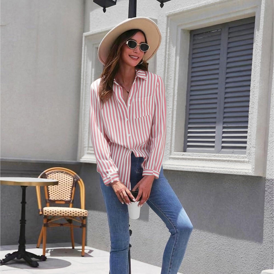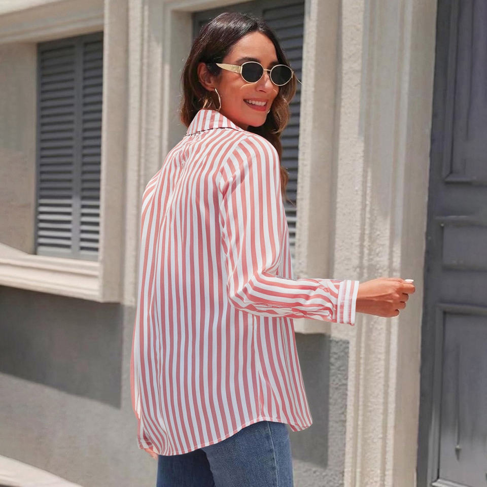 เสื้อเบลาส์แขนยาวลายทางสำหรับผู้หญิง, เสื้อเชิ้ตผ้าโพลีเอสเตอร์ระบายอากาศได้ดีสไตล์แฟชั่นสำหรับสำนักงานฤดูใบไม้ผลิ/ฤดูร้อน