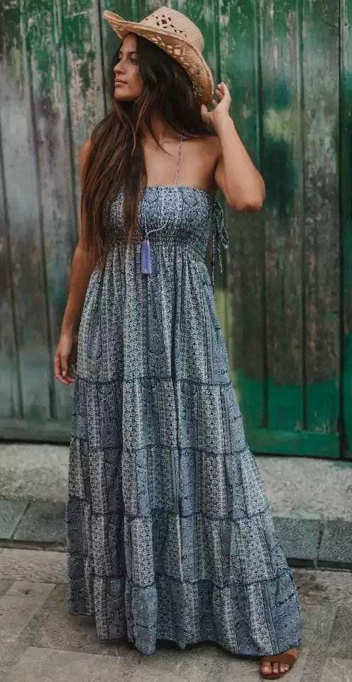 เดรสแม็กซี่สำหรับวันหยุดฤดูร้อนฤดูร้อนหรูหราของผู้หญิงชุดเดรสผ้าทอโบฮีเมียนแขนกุดยาวถึงพื้นเอวธรรมชาติซักได้