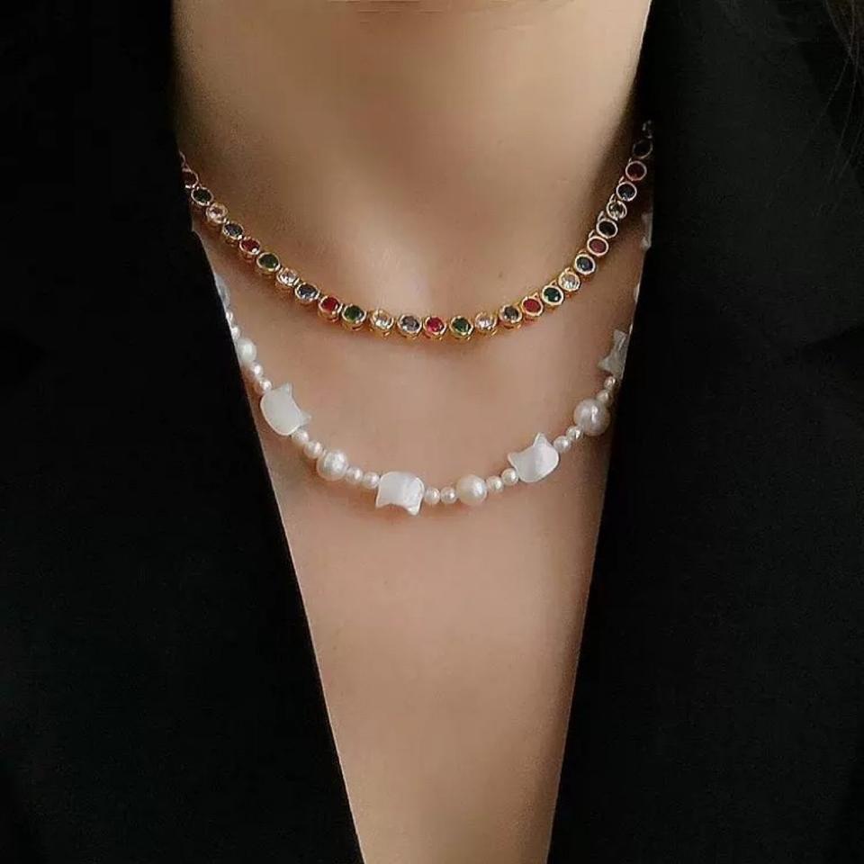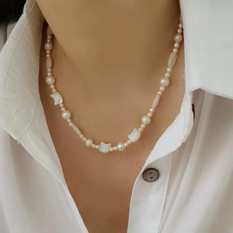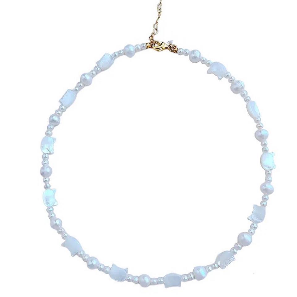 สร้อยคอมุกน้ำจืดทรงหรูหราทันสมัยสำหรับผู้หญิง ประดับเปลือกหอยรูปผีเสื้อสีขาวธรรมชาติ เหมาะสำหรับฤดูร้อน สไตล์ใหม่ สร้อยคอมุกทรงแมว