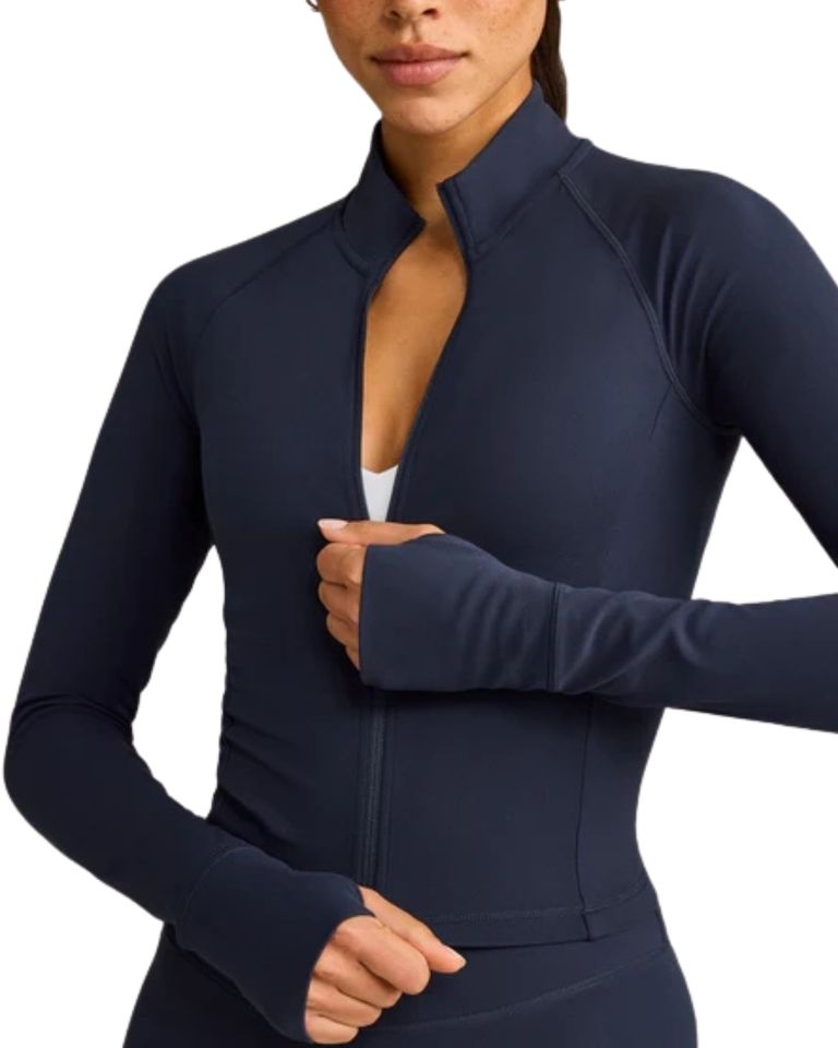 เสื้อแจ็คเก็ตโยคะผู้หญิงแบบยืดได้สี่ทิศทาง ระบายอากาศ กันน้ำ ซิปเต็มตัว ทรงครอปท็อป มีรูสอดนิ้วโป้ง คอตั้ง ทรงเข้ารูป เหมาะสำหรับวิ่งและออกกำลังกาย