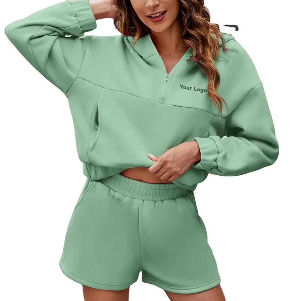 ชุดเซ็ตสองชิ้นผ้าฝ้ายสำหรับผู้หญิง ฤดูใบไม้ร่วง เสื้อฮู้ดดี้ทรงหลวมหนา และกางเกงขาสั้นแฟชั่น ชุดลำลองสำหรับผู้หญิง แบบสั่งทำได้