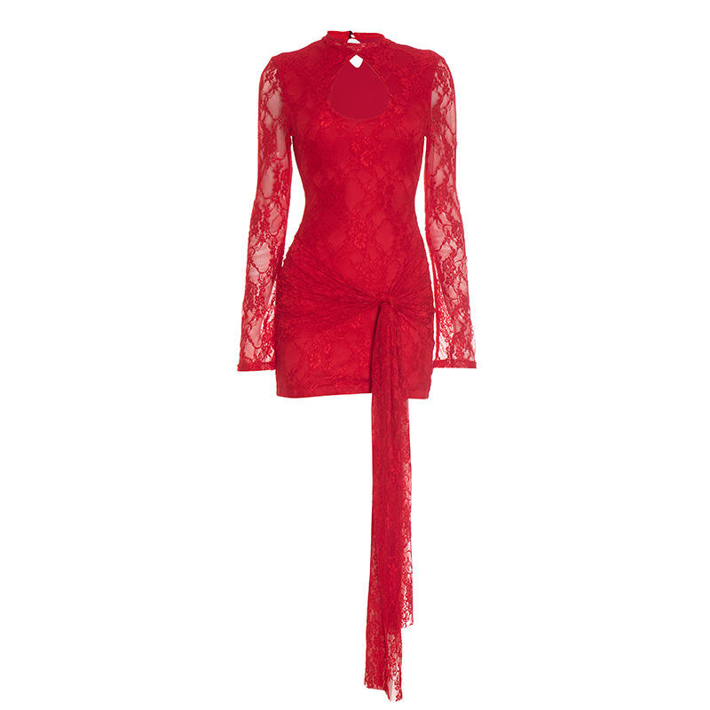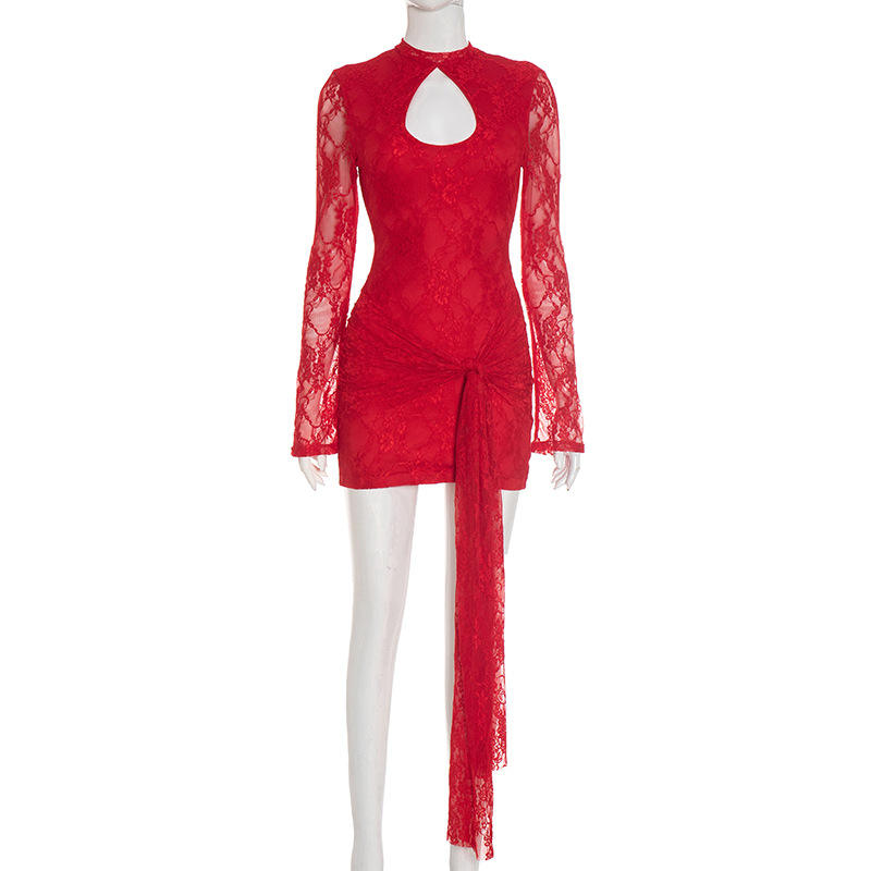 เดรสสั้นแฟชั่นผู้หญิงคอลเลคชั่นใหม่ประจำฤดูใบไม้ร่วง สีพื้น แต่งเชือกผูก โชว์ช่วงเอว เซ็กซี่ แต่งลูกไม้ แขนยาว ผูกโบว์