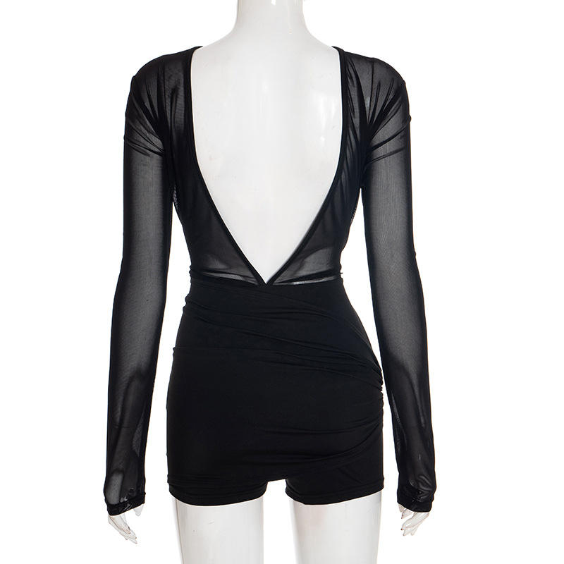 จั๊มสูทขาสั้นแฟชั่นผู้หญิงคอลเลคชั่นใหม่ประจำฤดูใบไม้ร่วง สีพื้น เซ็กซี่ ผ้าตาข่ายบาง แขนยาว เปิดหลัง แต่งระบาย