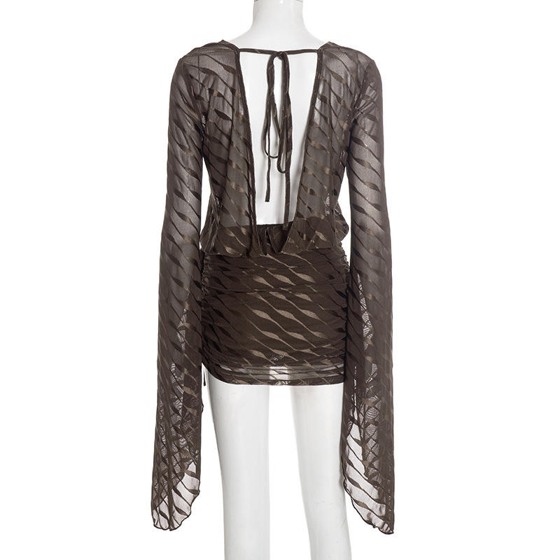 เดรสแฟชั่นผู้หญิงคอลเลคชั่นใหม่ประจำฤดูใบไม้ร่วง สีพื้น ผ้าตาข่ายลายคลื่น แขนยาวทรงกระดิ่งไขว้หลัง โชว์หลังเปลือย