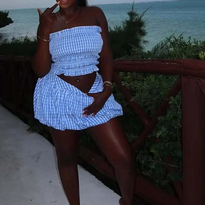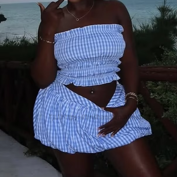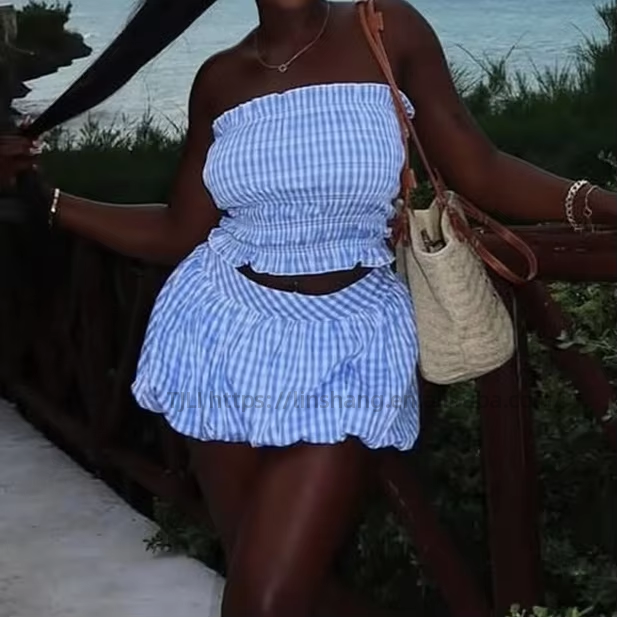ชุดเซ็ต 2 ชิ้น เสื้อครอปสายเดี่ยวลายทางเข้ารูปเอว พร้อมกระโปรงทรงพอง แฟชั่นสำหรับผู้หญิง คอลเลคชั่นใหม่ประจำฤดูใบไม้ร่วง