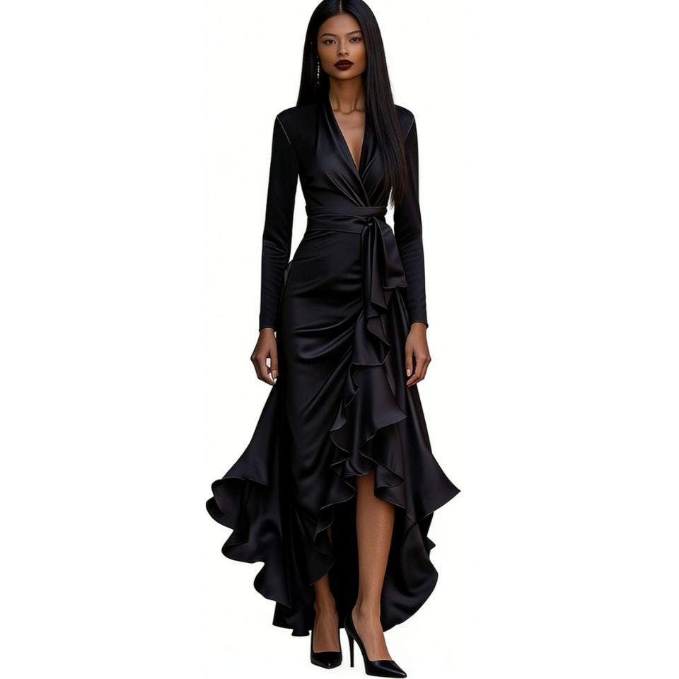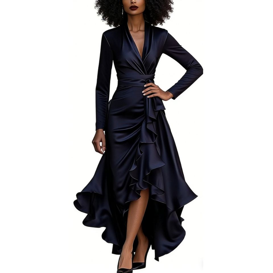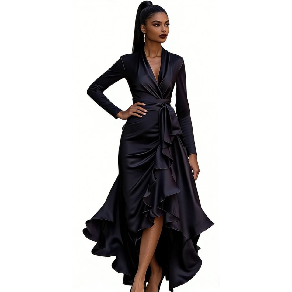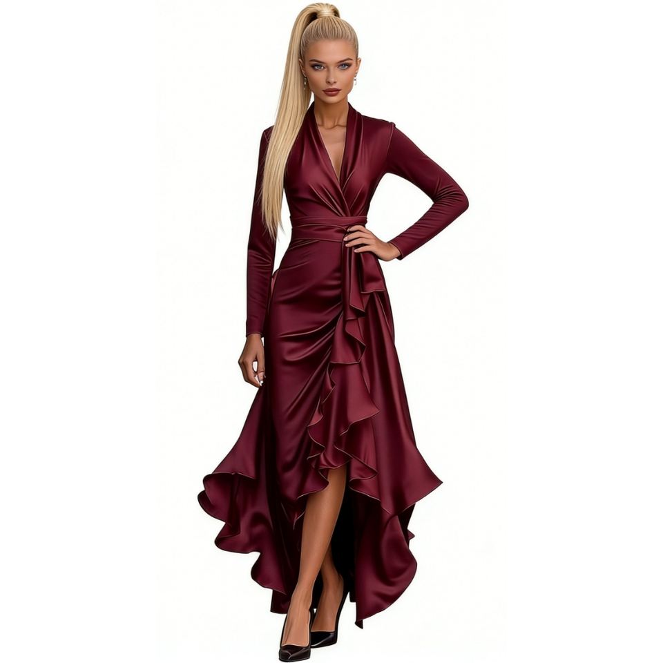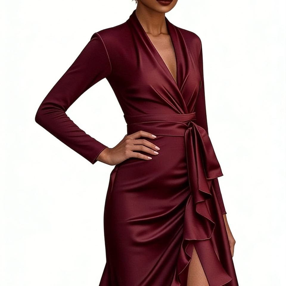 เดรสแฟชั่นผู้หญิงคอวีทรงเข้ารูปช่วงเอวแต่งระบายผ่าข้างสำหรับฤดูใบไม้ร่วง