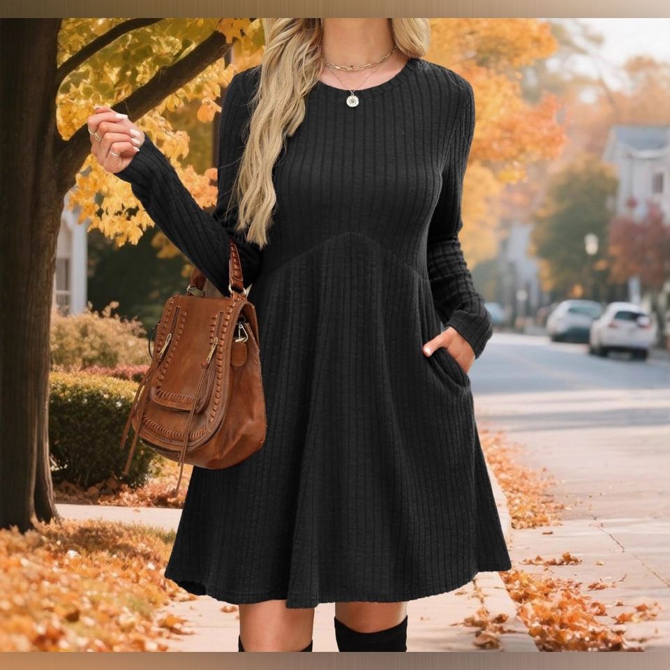 เดรสแฟชั่นผู้หญิงสไตล์โบฮีเมียนสำหรับฤดูใบไม้ร่วง/ฤดูหนาว คอเสื้อพองแบบไม่สมมาตร สีพื้น