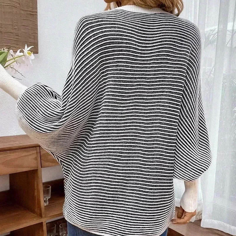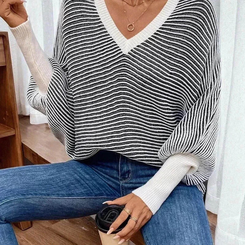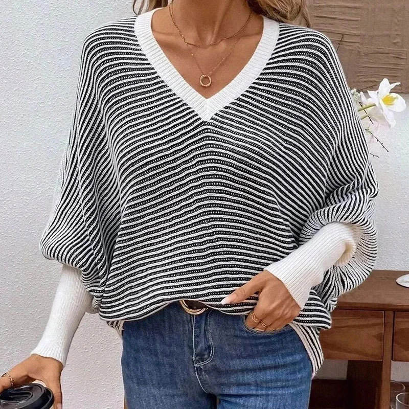 เสื้อสเวตเตอร์ไหมพรมลายทาง คอวี แขนทรงปีกค้างคาว ทรงหลวม สไตล์แฟชั่นสำหรับผู้หญิง คอลเลคชั่นใหม่ประจำฤดูใบไม้ร่วง/ฤดูหนาว