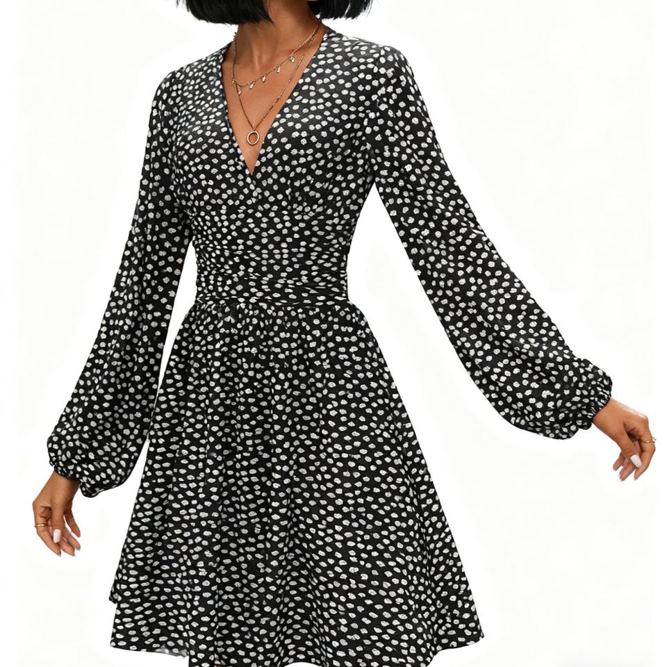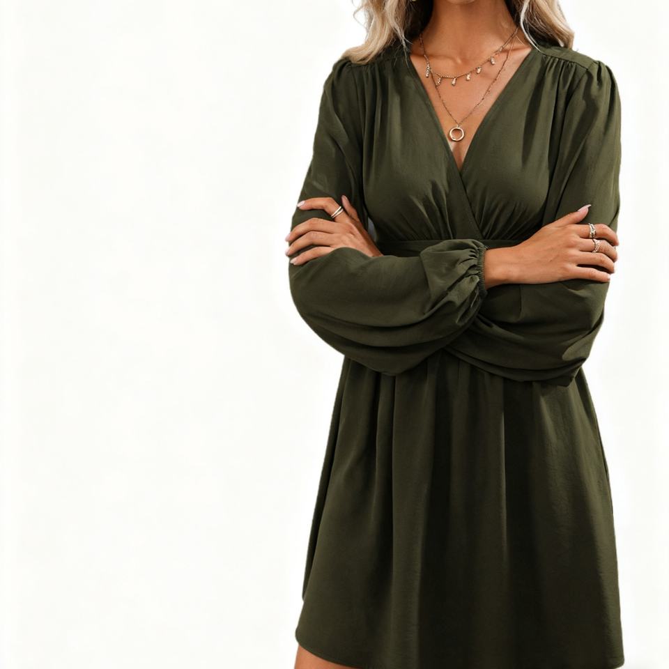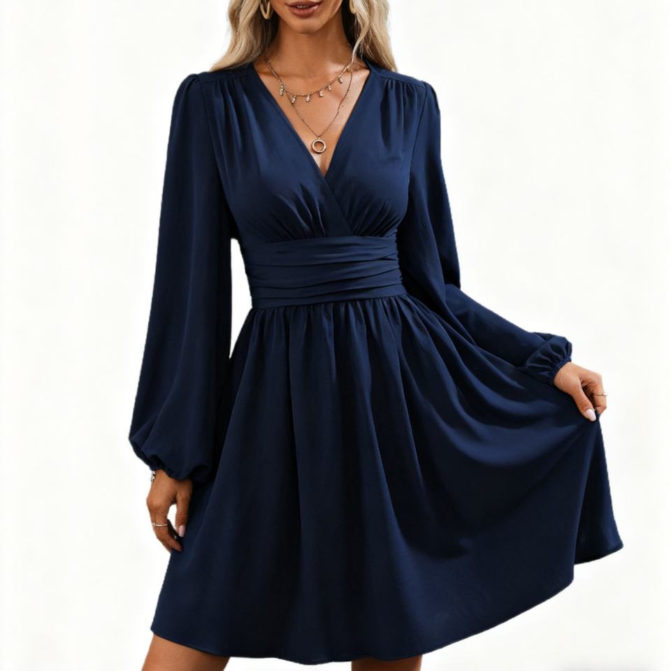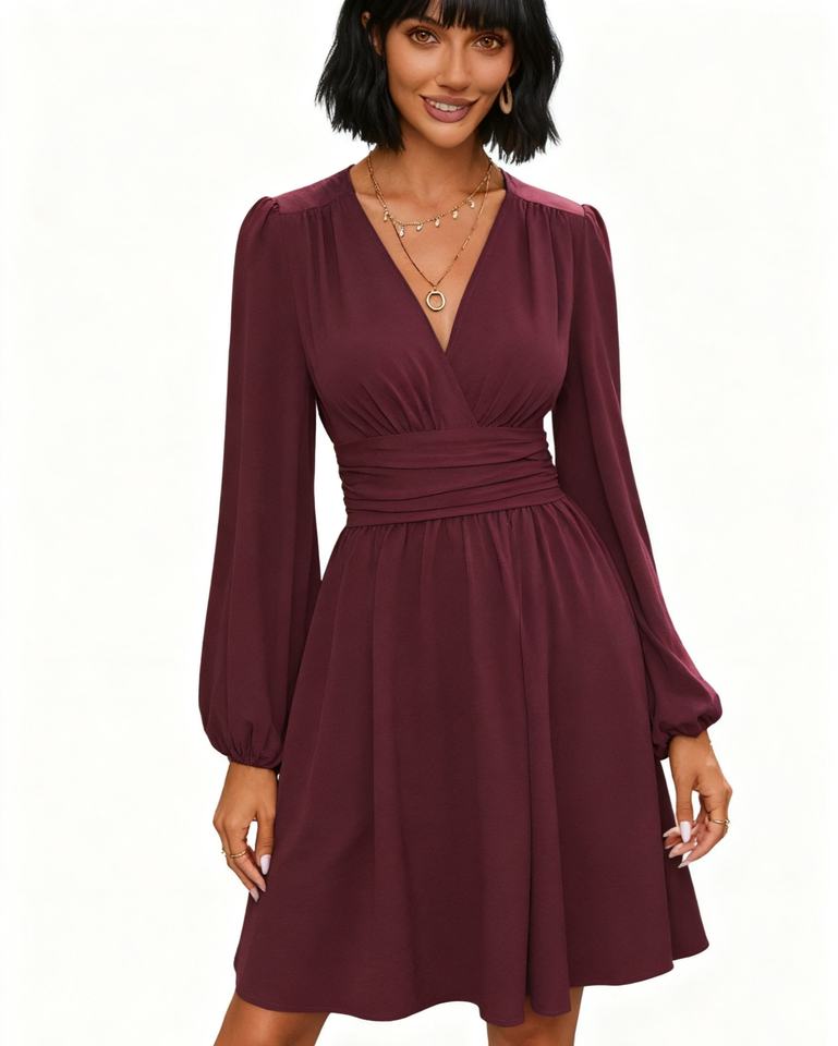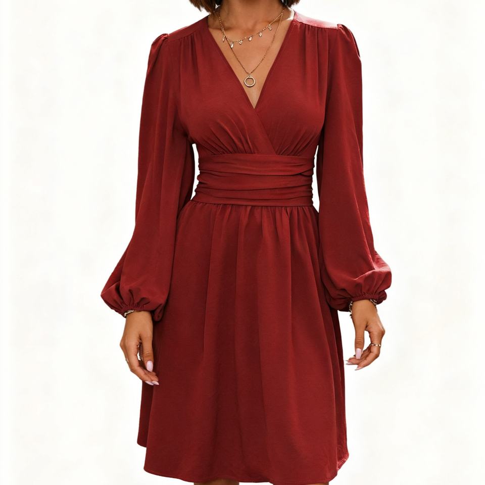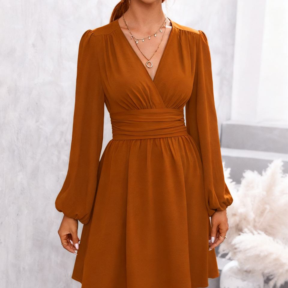 เดรสแฟชั่นสีพื้นเอวมีจีบแขนกระดิ่งคอวีแฟชั่นฤดูใบไม้ร่วง/ฤดูหนาว