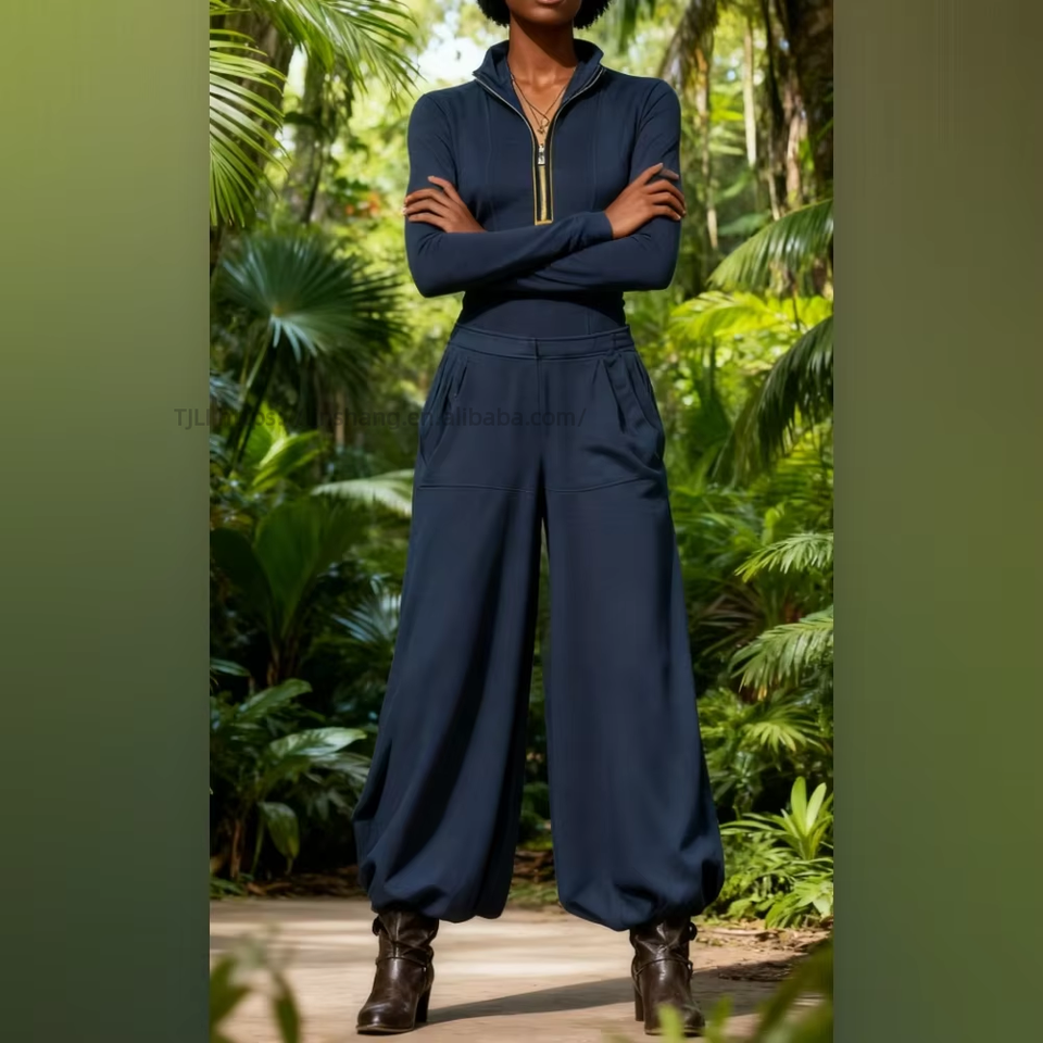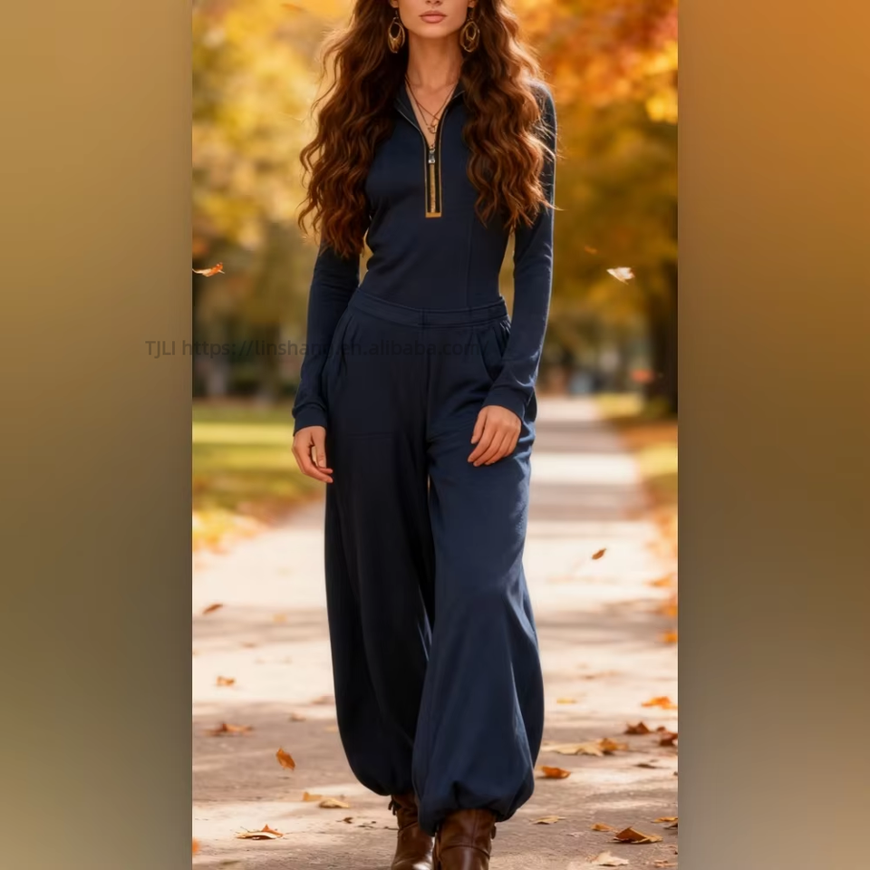 ชุดเซ็ต 2 ชิ้น เสื้อและกางเกงลำลองแฟชั่นสำหรับผู้หญิง คอลเลคชั่นใหม่ประจำฤดูใบไม้ร่วง/ฤดูหนาว พร้อมซิป คอตั้ง และกระเป๋า