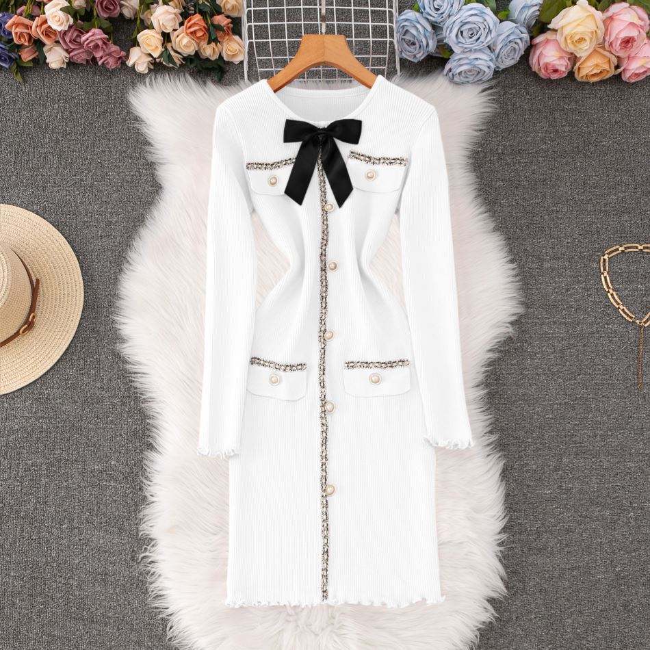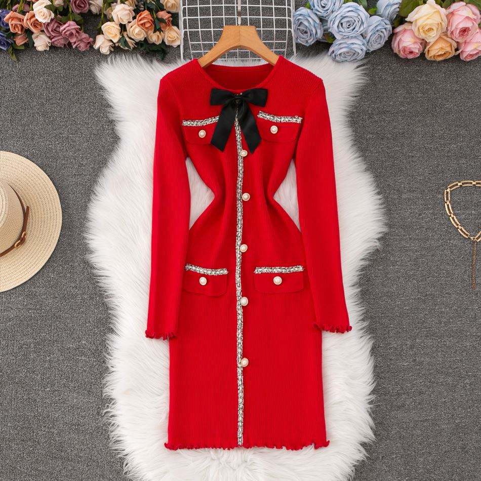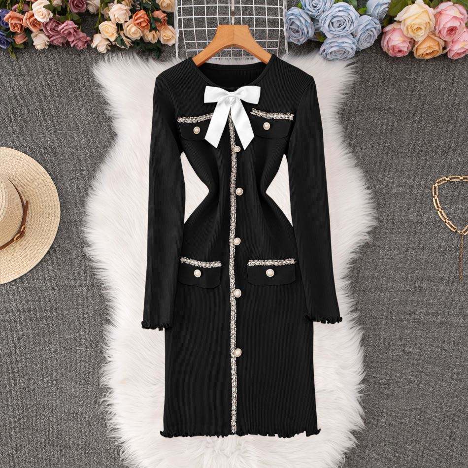เดรสไหมพรมแขนยาวทรงเข้ารูปประดับโบว์สุดหรูสำหรับผู้หญิง คอลเลคชั่นใหม่ประจำฤดูใบไม้ร่วง/ฤดูหนาว