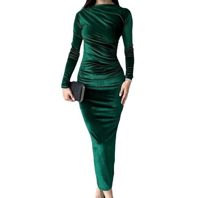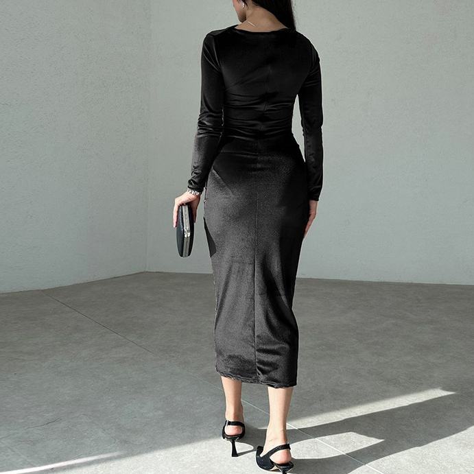 เดรสแฟชั่นผู้หญิงคอลเลคชั่นใหม่ประจำฤดูใบไม้ร่วง/ฤดูหนาว ทรงเข้ารูป คอทรงกลม แขนยาว สีพื้น แต่งจีบ