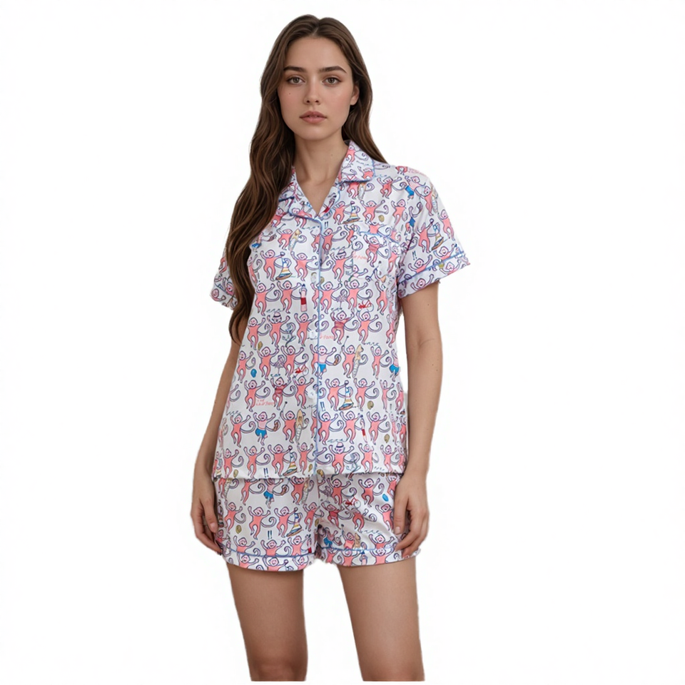 ชุดนอนผ้าโพลีเอสเตอร์พิมพ์ลายหรูหราสำหรับผู้หญิง แห้งเร็ว แขนสั้น เอวยางยืด เหมาะสำหรับฤดูใบไม้ผลิ