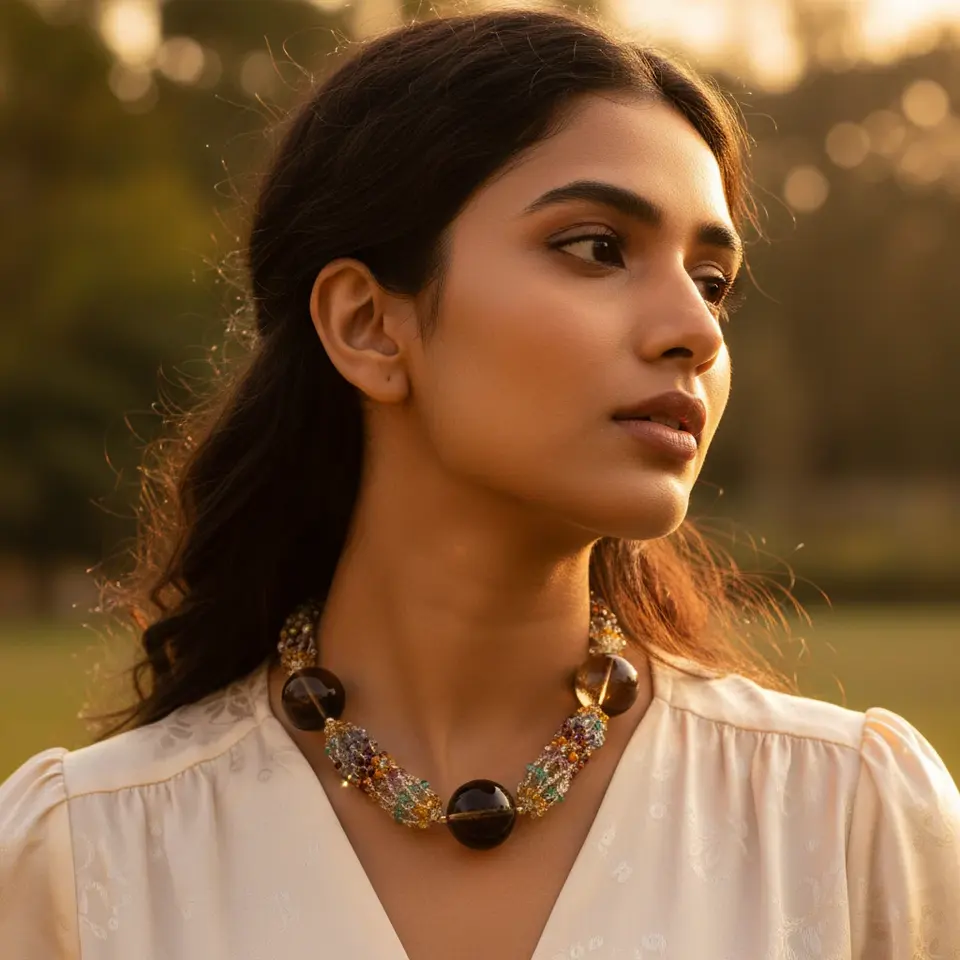 Women's Fashion Gold-Plated Beaded Gemstone Statement Necklace with Diamond Geometric Link Chain Jewelry