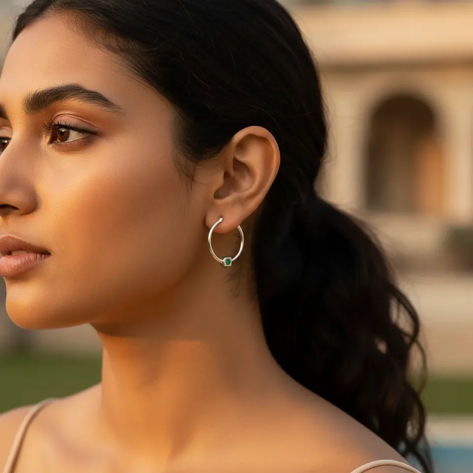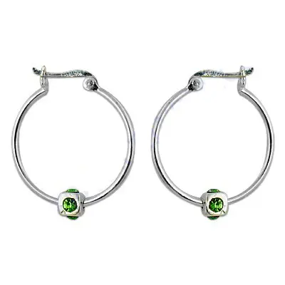 Women's Fashion Stud Earrings Silver Hoop with Green Gemstone Jewelry
