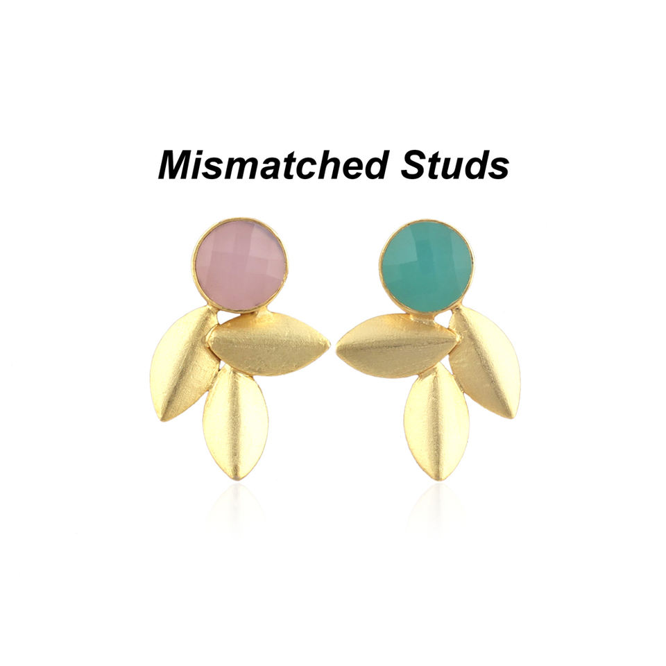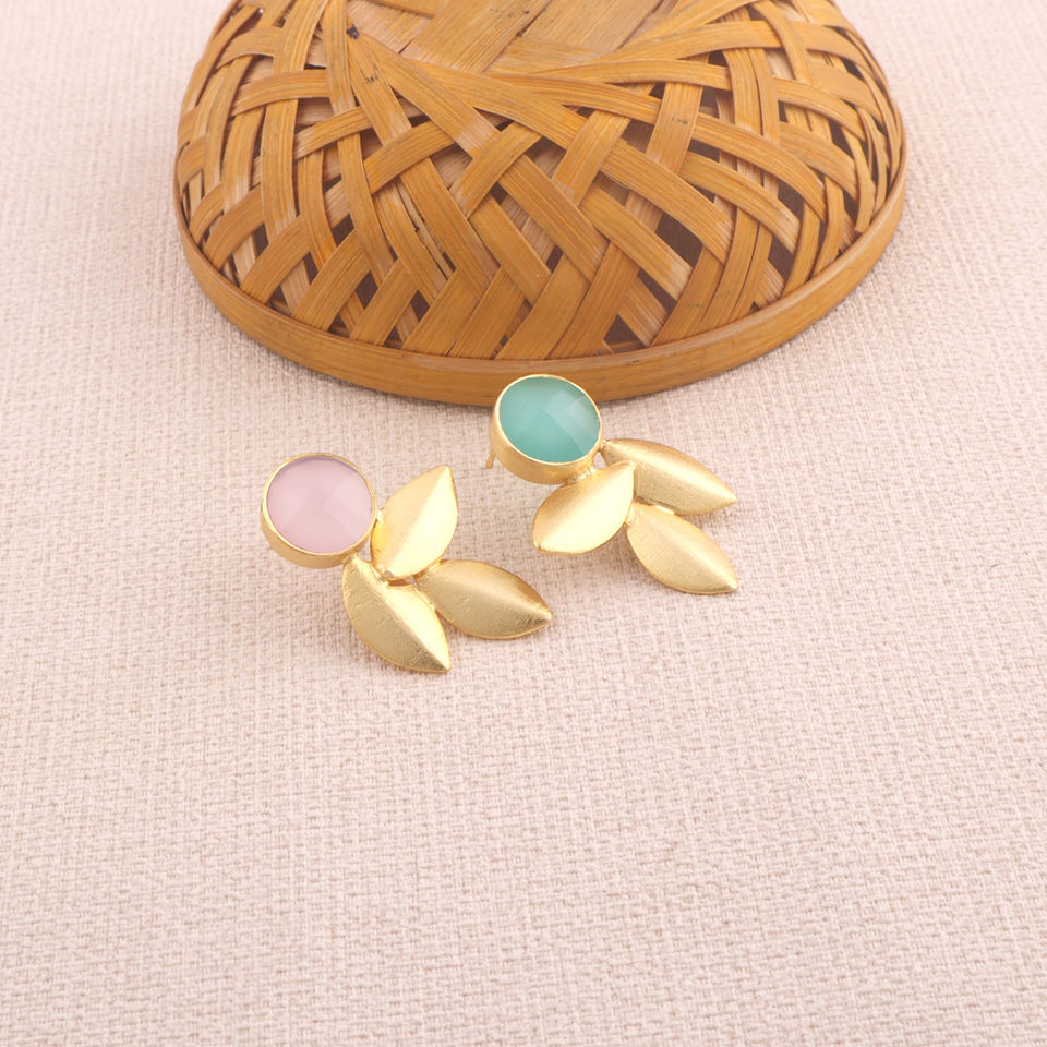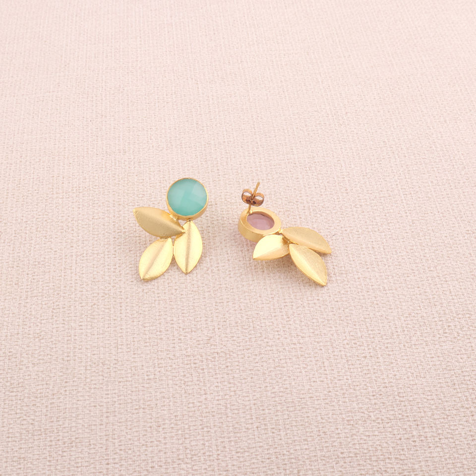 ต่างหูแฟชั่นสตรีแบบไม่มีคู่ลายเช็คเกอร์ตัดสีชมพูอะควาคาเซโดนีรูปทรงเรขาคณิตสามใบชุบทองของขวัญหินชิ้นเดียว