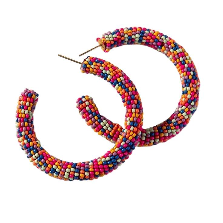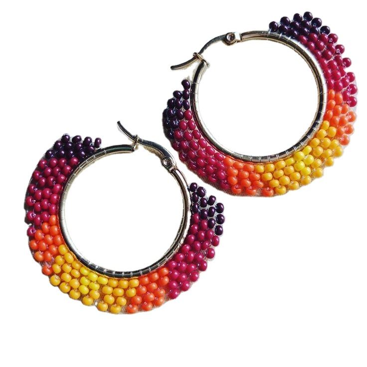 ต่างหูลูกปัดหลากสีสไตล์ชนเผ่าแฟชั่นสำหรับผู้หญิงต่างหูแก้วเพชรทำด้วยมือห่วงใหญ่รูปทรงเรขาคณิต