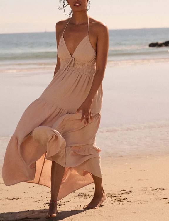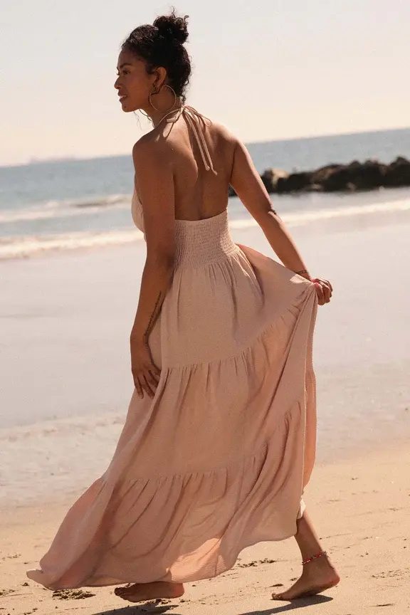 ชุดเดรสผ้าเรยอนมัดย้อมแขนยาวสำหรับผู้หญิงเดรสแม็กซี่แขนยาวเปิดหลังสายคล้องคอแฟชั่นสำหรับใส่ไปทะเลหรือใส่ในรีสอร์ตสำหรับฤดูร้อน