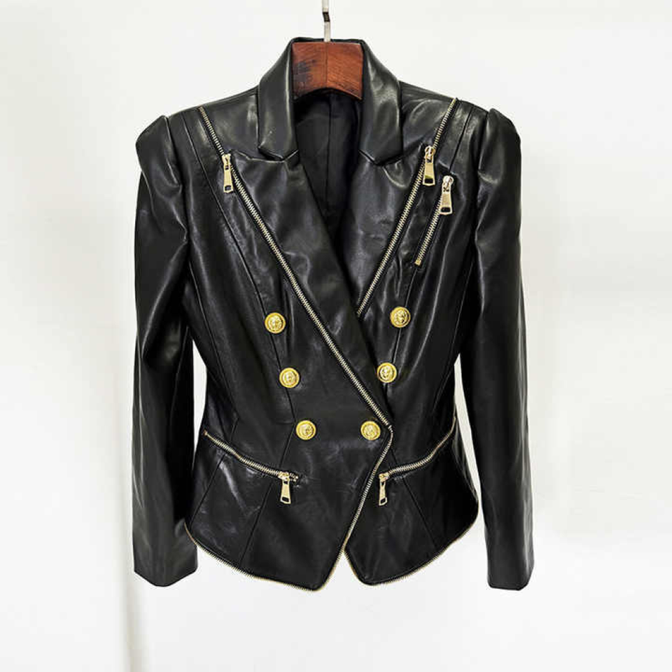 แจ็กเก็ตเบลเซอร์หนังเทียมสำหรับผู้หญิงเสื้อแจ็คเก็ตนักขี่มอเตอร์ไซค์สีดำระบายอากาศได้แฟชั่น